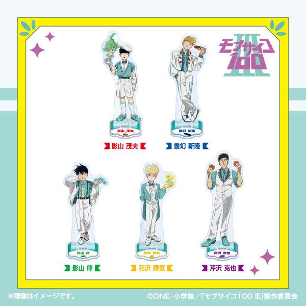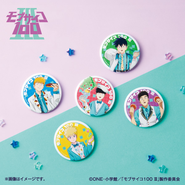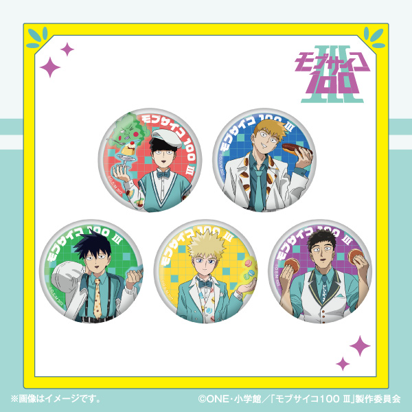 スイーツモチーフの限定描き下ろしイラストを使用した、影山 茂夫・霊幻たちの「缶バッジ」「アクリルスタンド」がラインナップ!