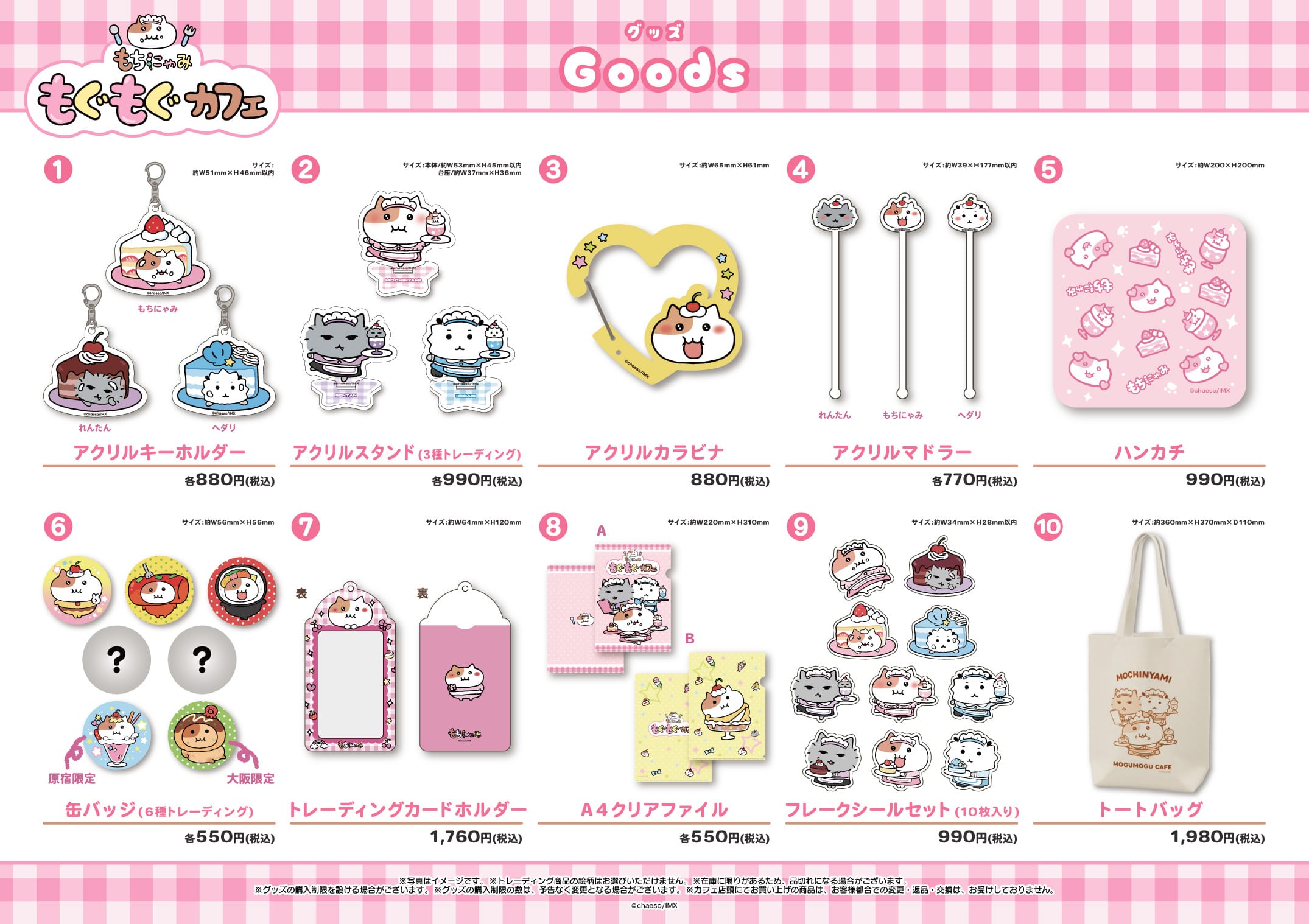 さらに、メイドや食べ物などに扮しているもちにゃみたちの描き下ろしイラストを使用した「アクリルキーホルダー」「アクリルスタンド」などのコラボカフェ限定グッズも発売!