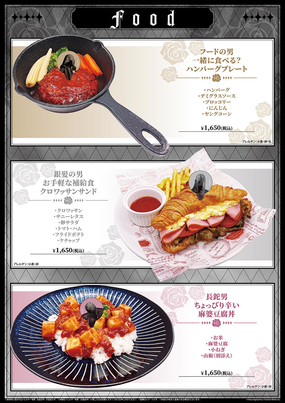 「フードの男 一緒に食べる?ハンバーグプレート」や「長鉈男 ちょっぴり辛い麻婆豆腐丼」などのボリューム満点のフード、Switch移植を記念した「スペシャルメニュー (アフタヌーンティー形式)」など、作品の世界観を堪能できるメニューが展開される。