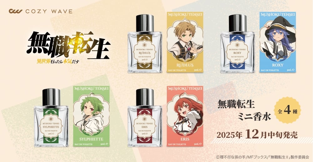 理不尽な孫の手先生による人気ライトノベルを原作としたアニメ『無職転生 ~異世界行ったら本気だす~』から、キャラクターをイメージしたミニ香水が2025年12月中旬にCOZYWAVEより発売される。