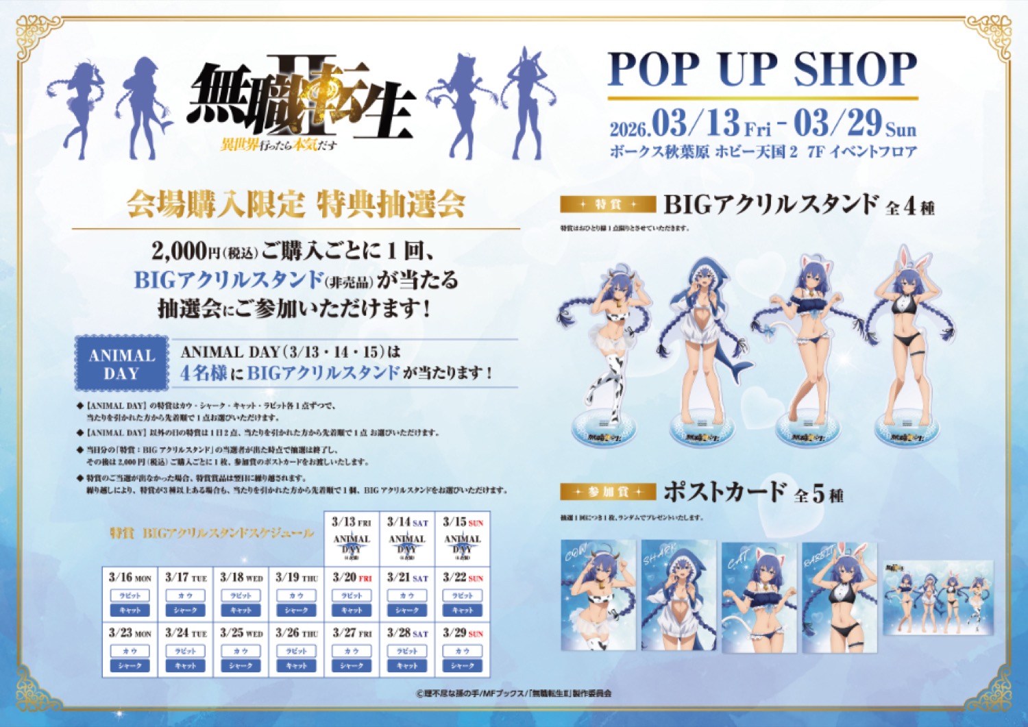 「無職転生Ⅱ ~異世界行ったら本気だす~」ポップアップストアにて、グッズをお買い上げ2,000円(税込)ごとに1回、豪華景品がランダムに当たる抽選会に参加できる。特典として描き下ろしノベルティー「特賞: BIGアクリルスタンド 全4種」、「参加賞: ポストカード 全5種」をがラインナップする。