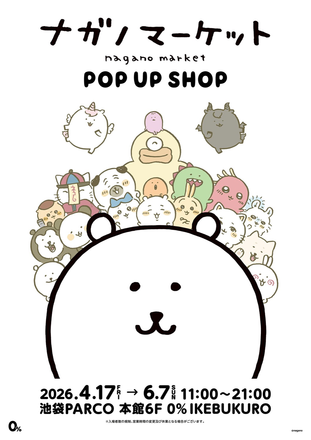 「ちいかわ」や「自分ツッコミくま」などを手掛ける大人気クリエイター「ナガノ」さんのポップアップストア『ナガノマーケット POP UP SHOP』が、池袋PARCO 本館6F 0%IKEBUKUROにて2026年4月17日〜6月7日まで開催される。
