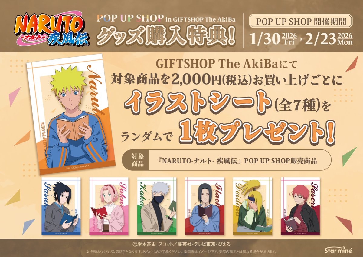 岸本斉史先生による大人気漫画を原作とするTVアニメ「NARUTO-ナルト- 疾風伝」のポップアップストアが、ギフトショップ The AkiBaにて2026年1月30日〜2月23日まで開催される。