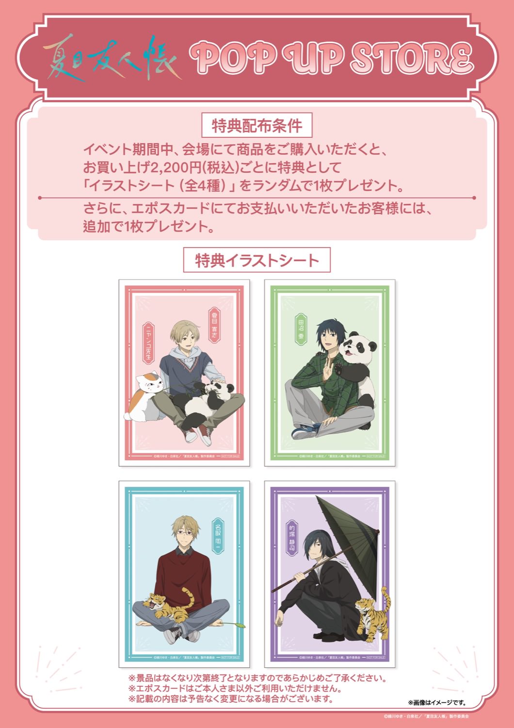 「夏目友人帳」ポップアップストアの会場にて、2,000円(税込)購入するごとに特典として「イラストシート (全4種)」をランダムに1枚プレゼント!なお、エポスカードにてお支払いした方には追加で1枚プレゼント!