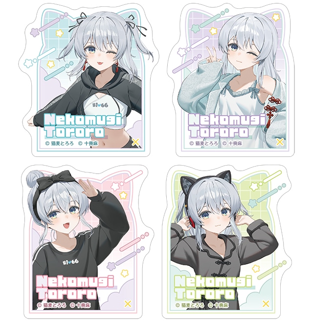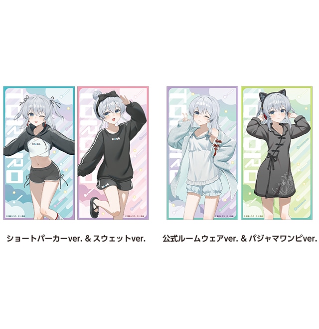 “ショートパーカーver.” “スウェットver.” “公式ルームウェアver. ” “パジャマワンピver.”などの描き下ろしイラストを使用した「アクリルスタンドBIG」「クリアカード2枚セット」「ダイカットステッカー4枚セット」などがラインナップする。