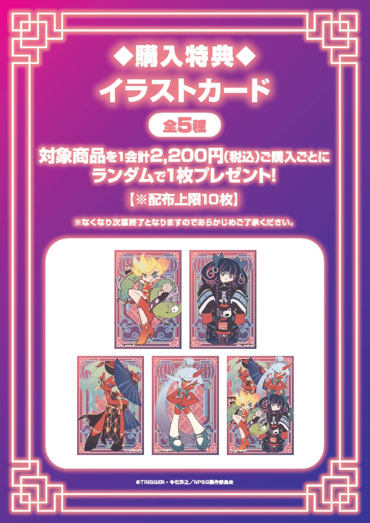 アニメ「Newパンティ & ストッキング」ポップアップストアでは、チャイナドレスをまとったパンティやストッキングたちのイベント限定イラストを使用した新作グッズが多数販売される他、グッズをお買い上げ2,200円(税込)ごとに特典として描き下ろしノベルティ「イラストカード 全5種」をランダムに1枚プレゼント!