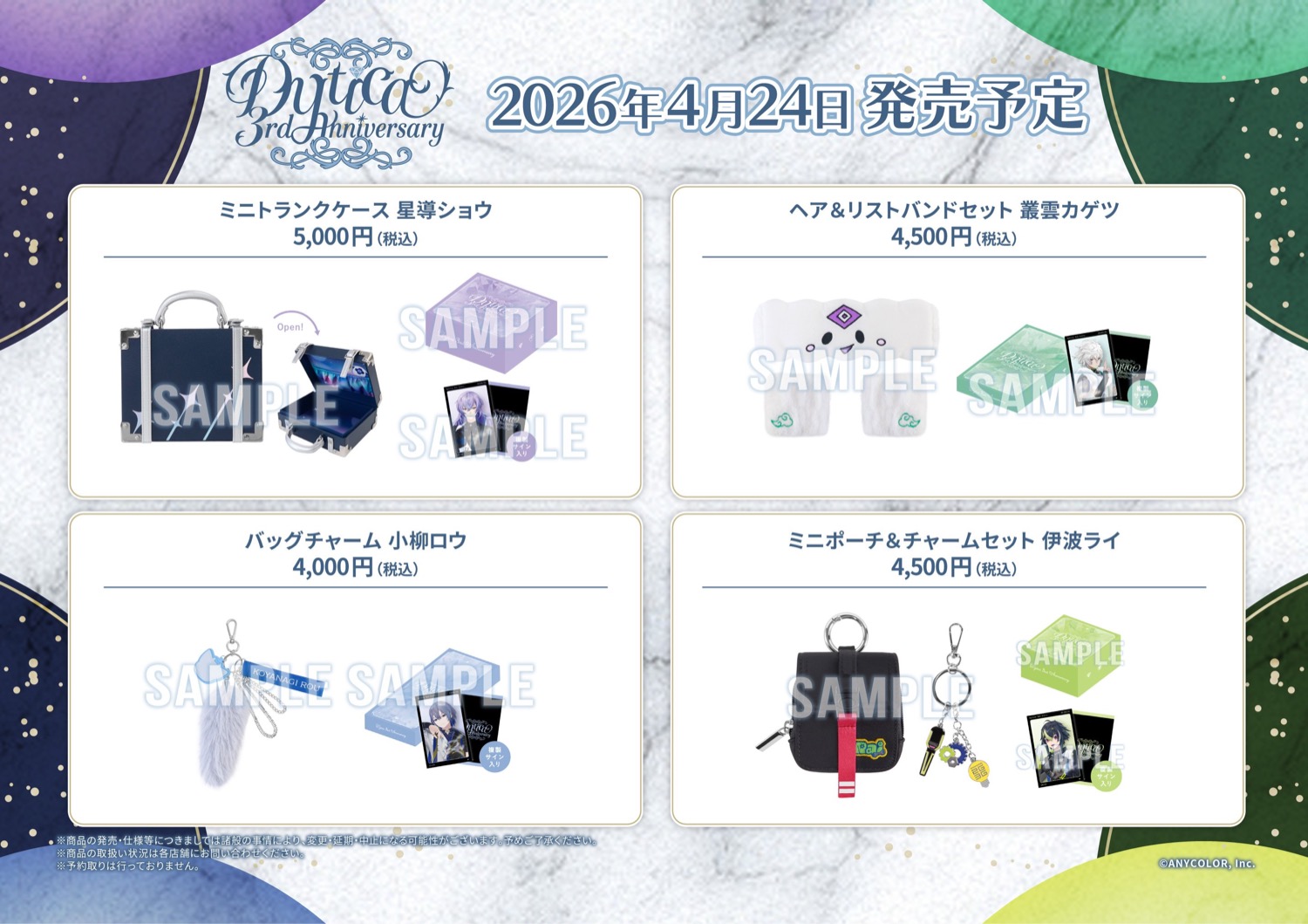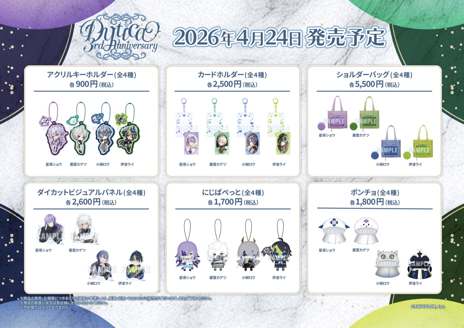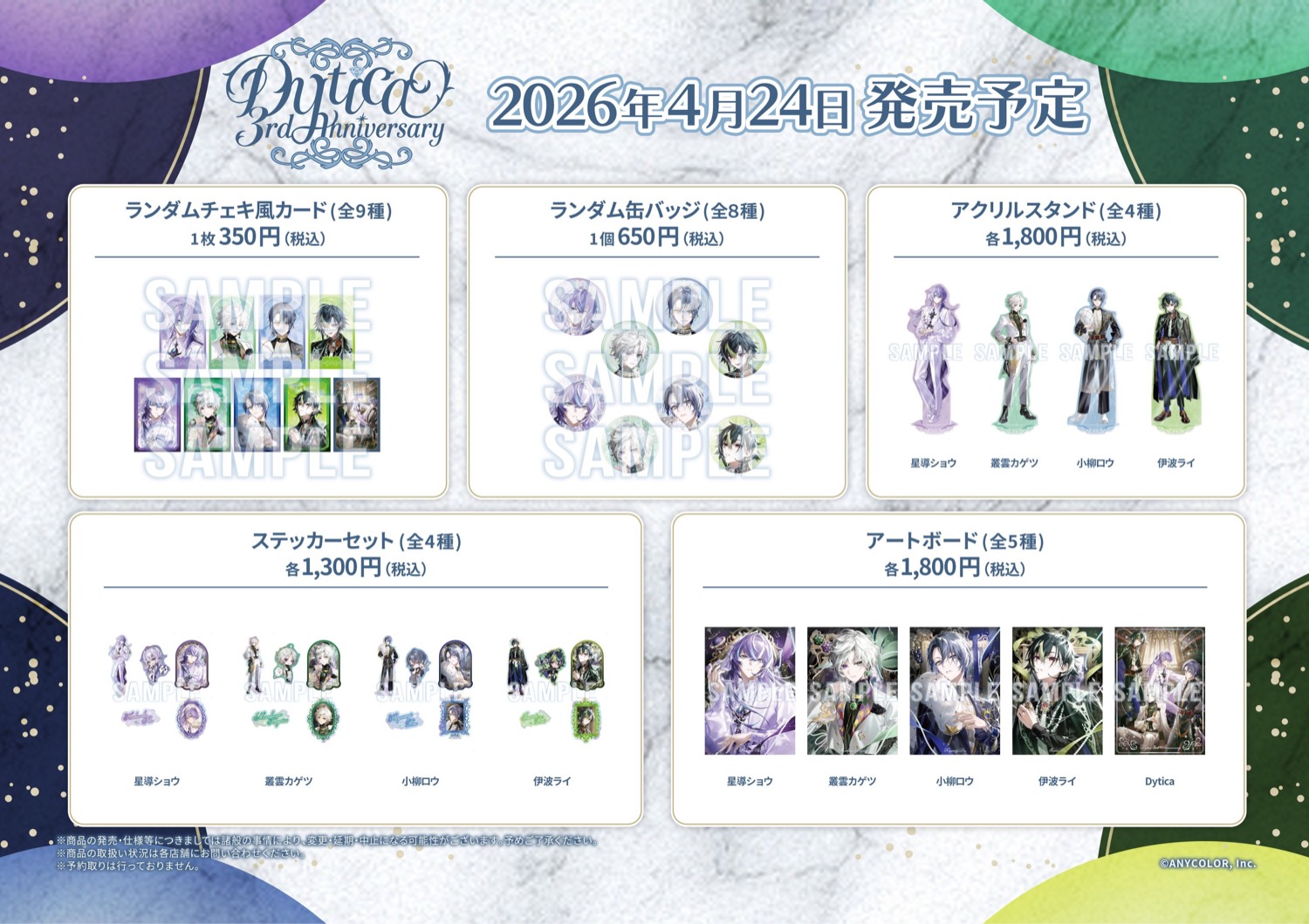 2026年4月24日より開催される『にじさんじ Dytica 3rd Anniversary フェア』では、星導ショウ・叢雲カゲツ・小柳ロウ・伊波ライたちの、Dyticaのデビュー3周年を記念したグッズが登場!