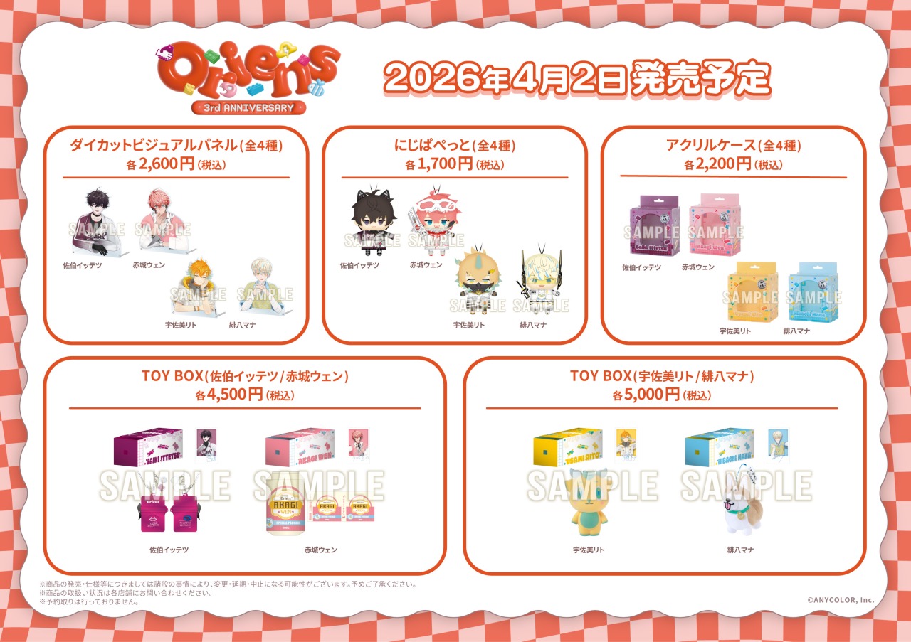 2026年4月2日より開催される『にじさんじ Oriens 3rd Anniversaryフェア』では、赤城ウェン・宇佐美リト・緋八マナ・佐伯イッテツたちのイラストを使用したグッズが登場!