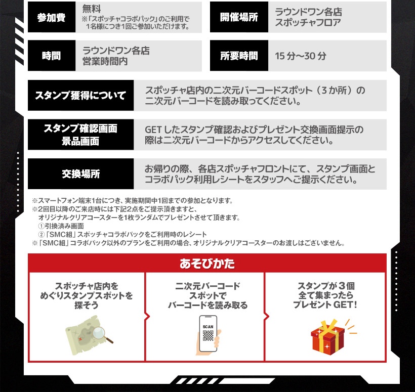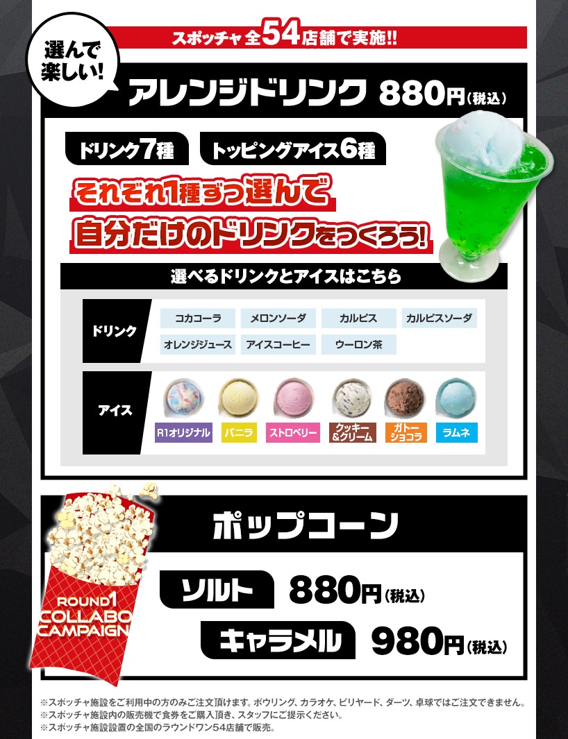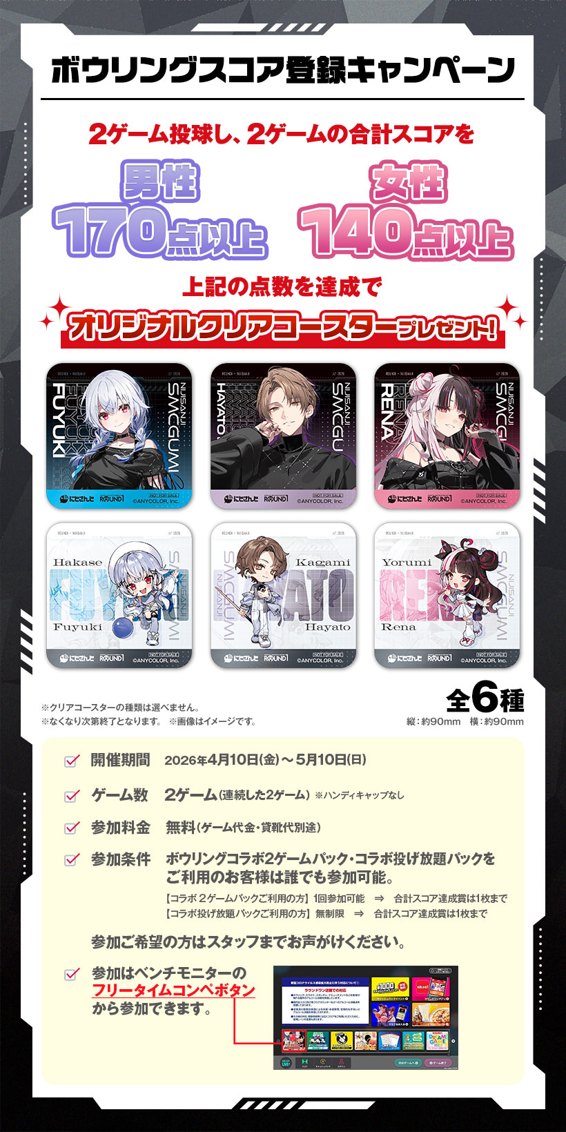 さらに、コラボメニューの注文やコラボパックの利用で貰えるオリジナルノベルティーが用意されているほか、ボウリングで指定のスコアを達成するともらえる「クリアコースター」や、スポッチャ限定の「ARデジタルスタンプラリー」など盛りだくさん!