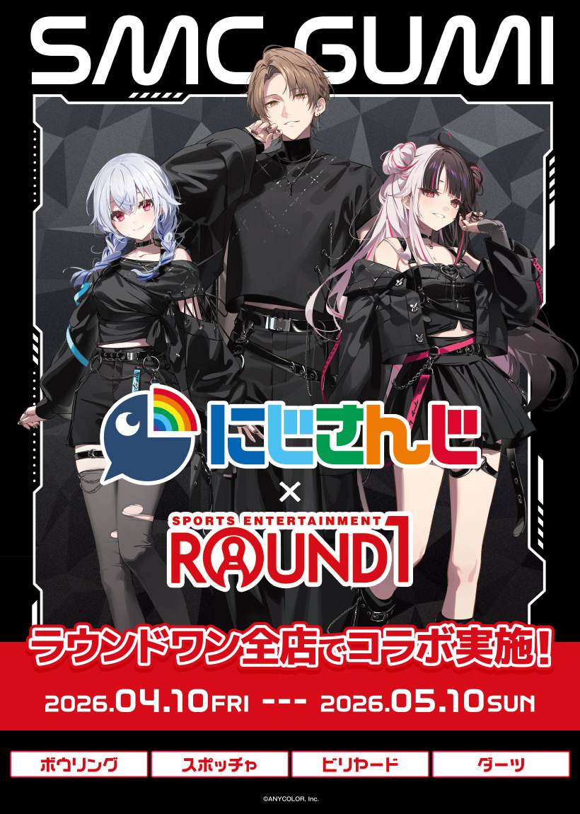 バーチャルライバーとして大人気を誇るVTuberグループ「にじさんじ」に所属する人気ユニット「SMC組」× ROUND1 (ラウンドワン)にて、2026年4月10日〜5月10日までコラボキャンペーンが開催される。