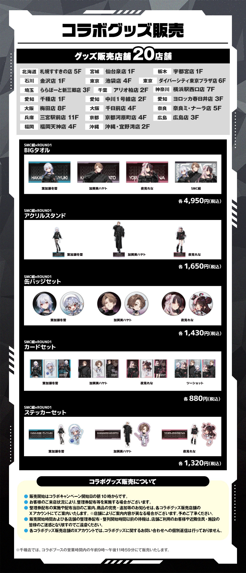 2026年4月10日より全国のROUND1 (ラウンドワン)にて、開催される「SMC組」のコラボキャンペーンでは、撮り下ろしビジュアルを使用したオリジナルグッズが発売!