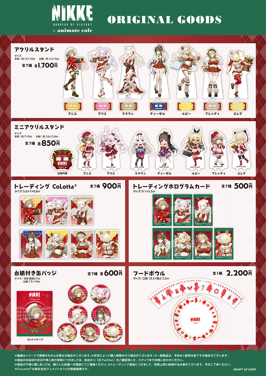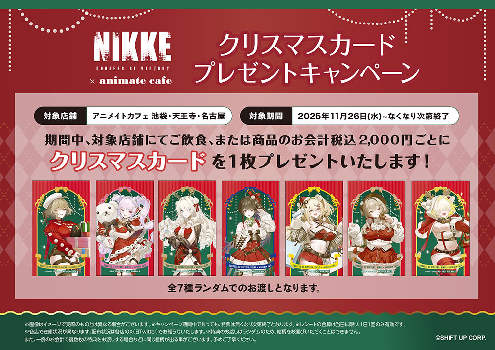 「勝利の女神:NIKKE × アニメイトカフェ 池袋/天王寺/名古屋」コラボにて、コラボメニューを1品注文するごとに「コースター (全7種)」をランダムに1枚、会計金額2,000円(税込)ごとに「クリスマスカード (全7種)」をランダムに1枚プレゼント!