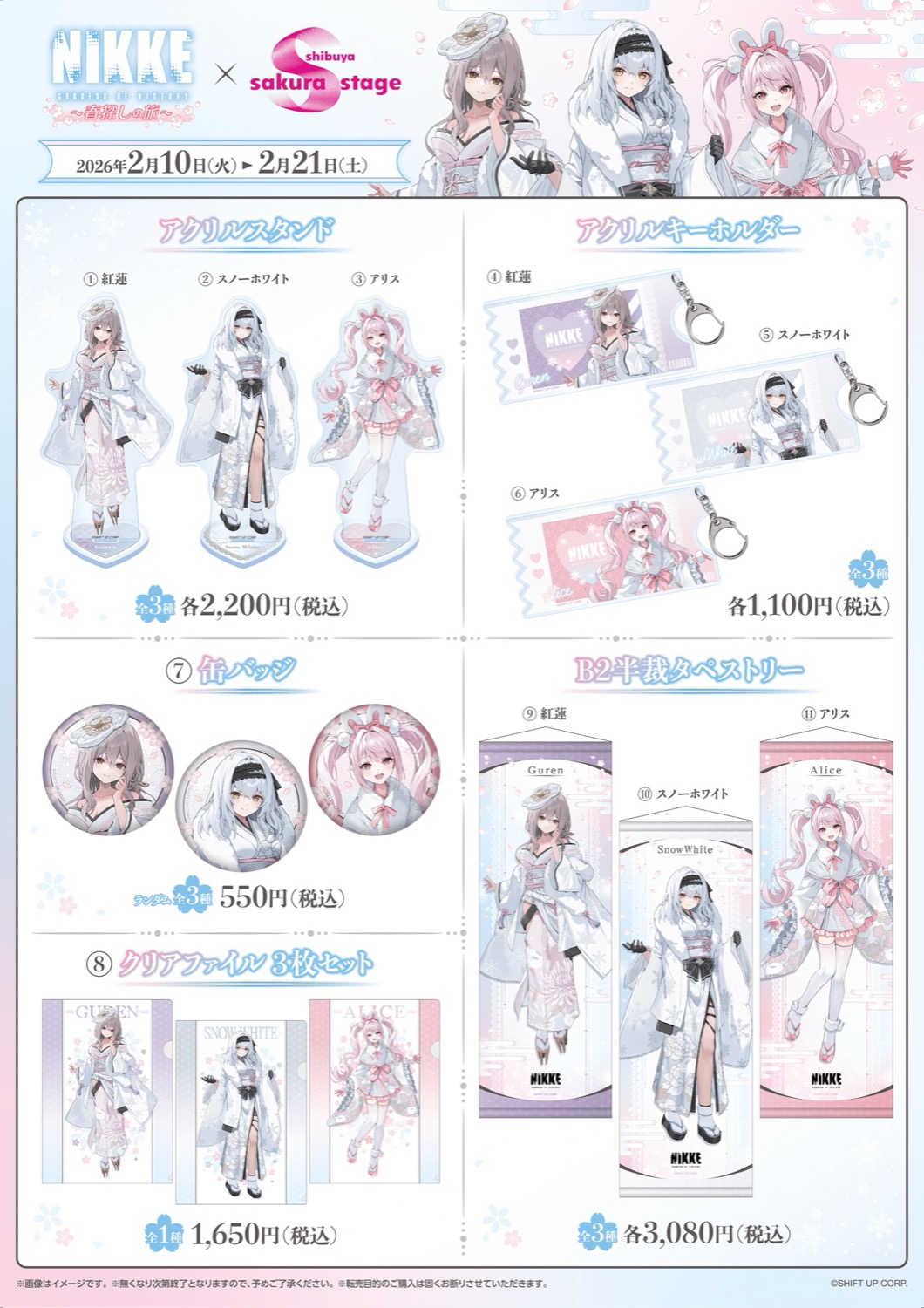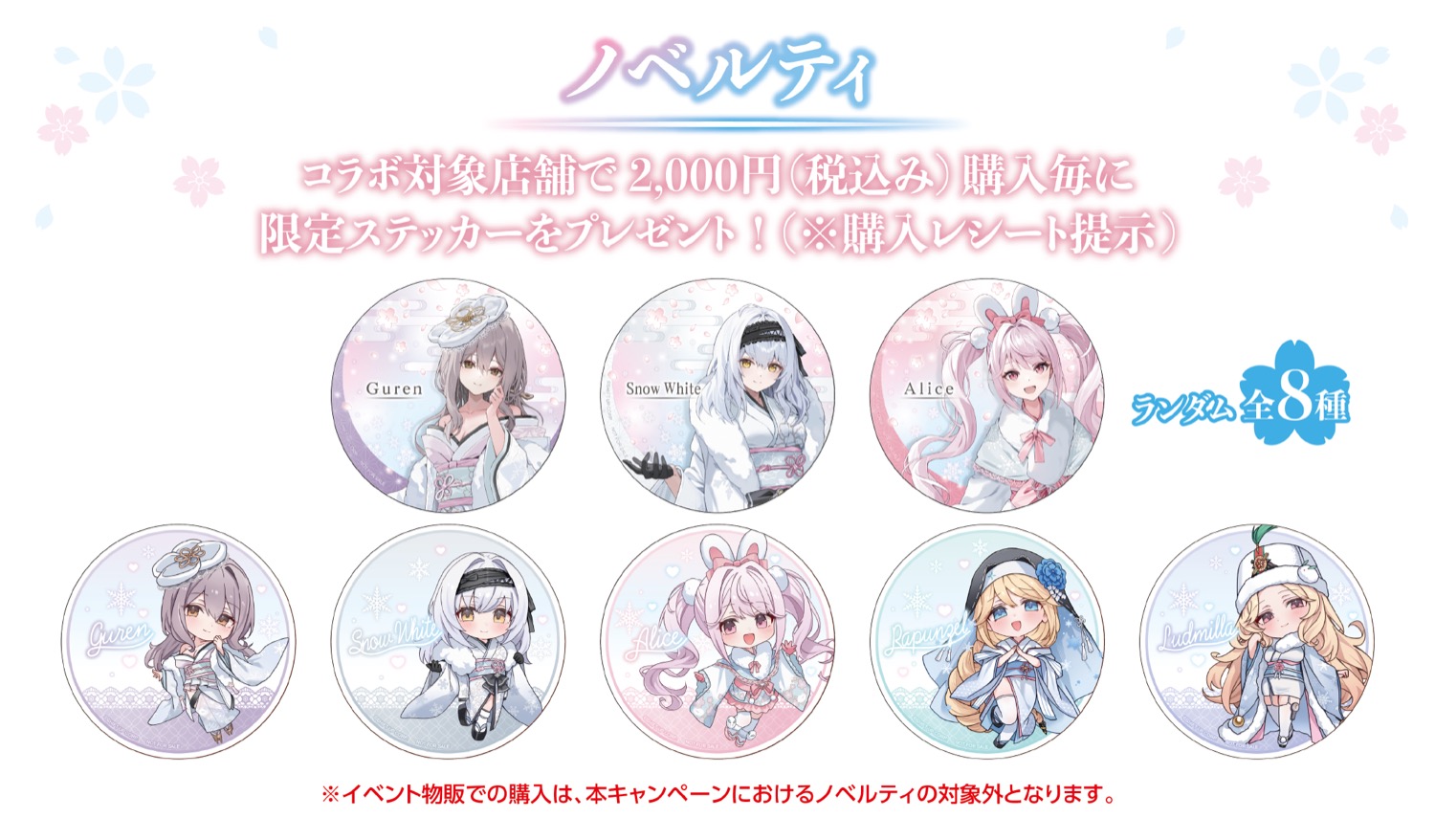 『勝利の女神:NIKKE 〜春探しの旅〜』では、紅蓮・スノーホワイト・アリスが白基調の和装コーデに身を包む、イベント限定描き下ろしイラストを使用した新作グッズが多数販売されるほか、グッズをお買い上げ2,000円(税込)ごとに特典として描き下ろしノベルティー「限定ステッカー 全8種」をランダムに1枚プレゼント!