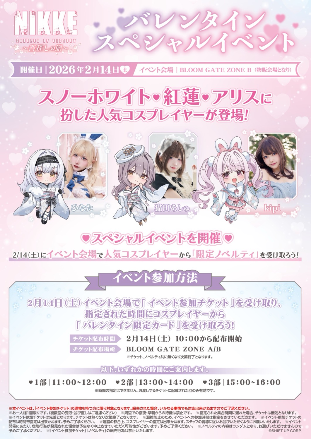 2026年2月14日にはイベント会場に、スノーホワイト・紅蓮・アリスに扮した人気コスプレイヤー(ひなた様 / 猫田あしゅ様 / kipi様)が登場!