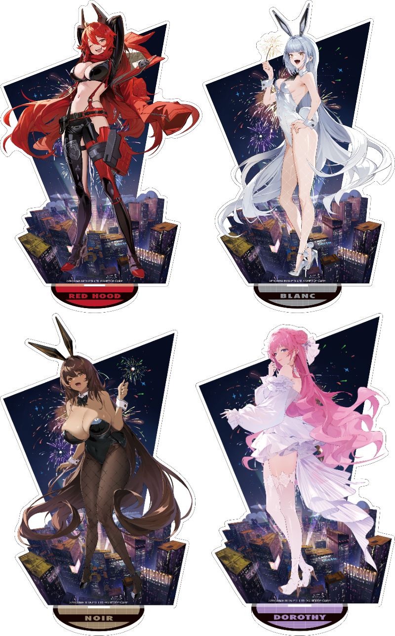 レッドフード、ブラン、ノワール、ドロシーらニケたち4人の美麗イラストを堪能できる「アクリルスタンド」や「スケートボードデッキ」、お部屋の主役になれる圧倒的存在感に注目したい「パブミラー」など指揮官必見の新商品が多数ラインナップ。