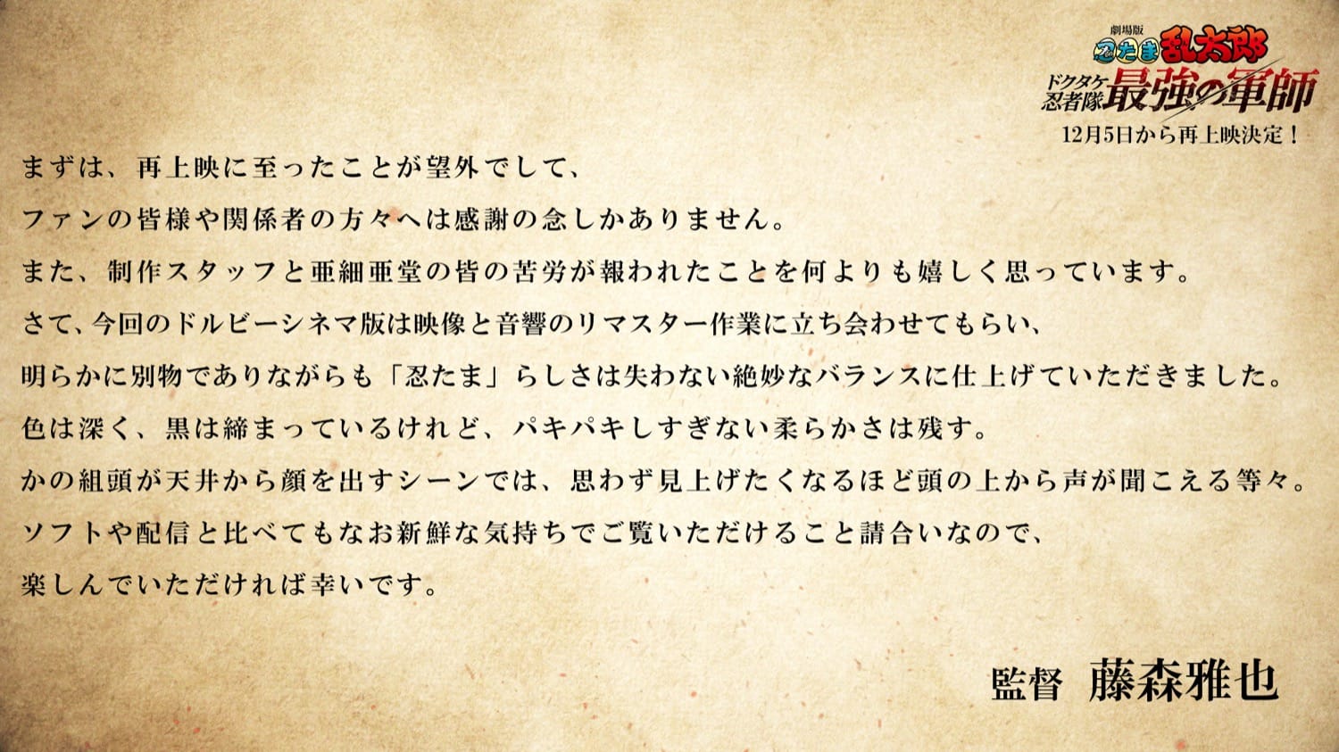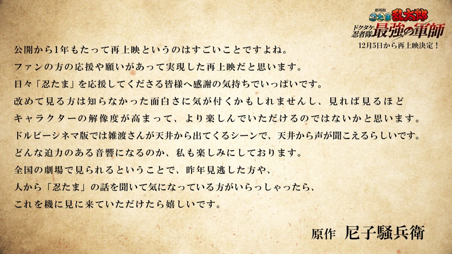 さらに、再上映にあたり、原作・尼子騒兵衛先生、監督・藤森雅也さんからコメントも到着した。