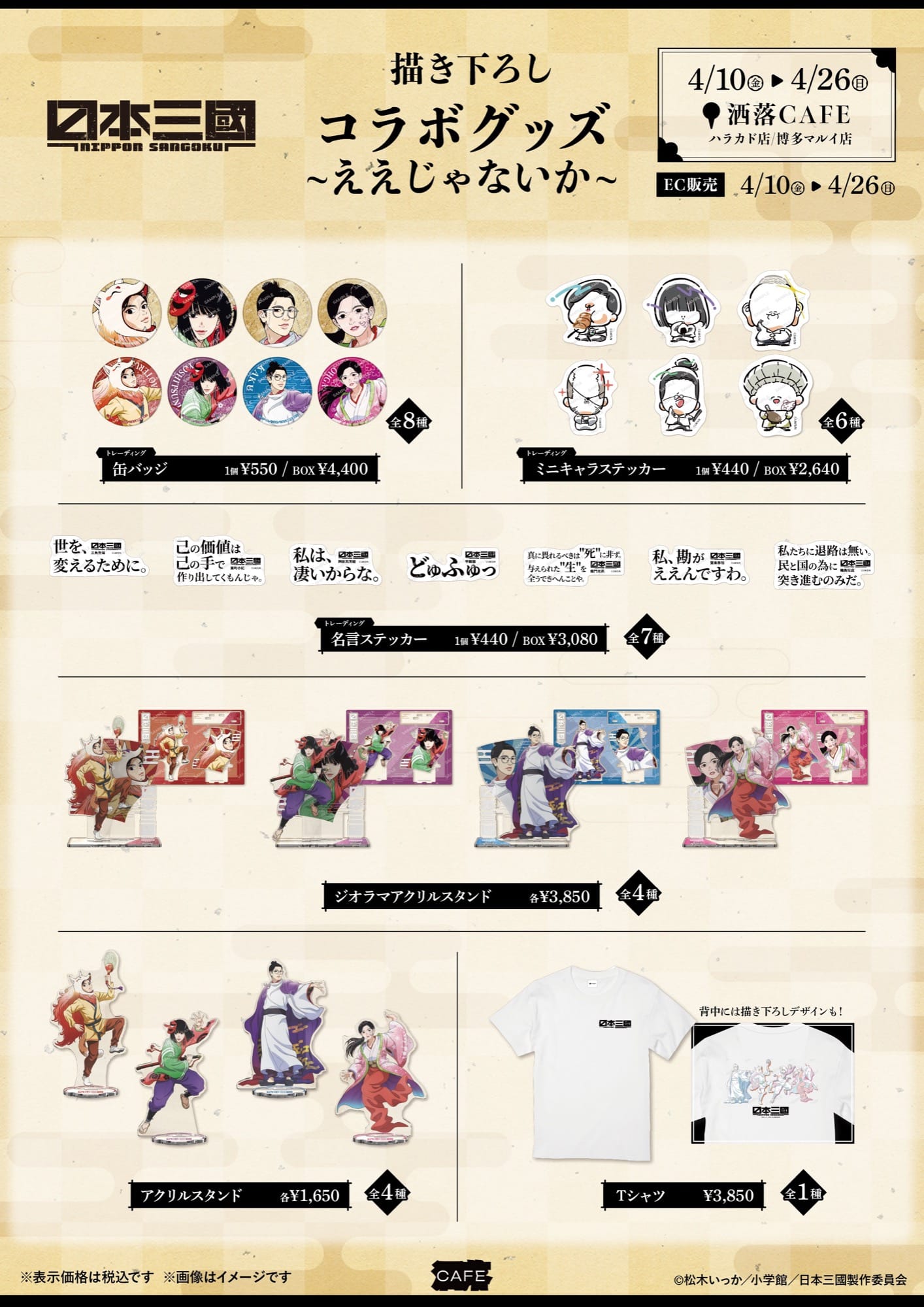 2026年4月10日より開催される「日本三國」カフェでは、敵も味方もなく踊り明かす一夜の群衆に立つ三角⻘輝、阿佐馬芳経、賀来泰明、輪島桜虎を描き下ろした「民衆の乱舞【ええじゃないか】」テーマのコラボカフェ限定グッズが多数登場。