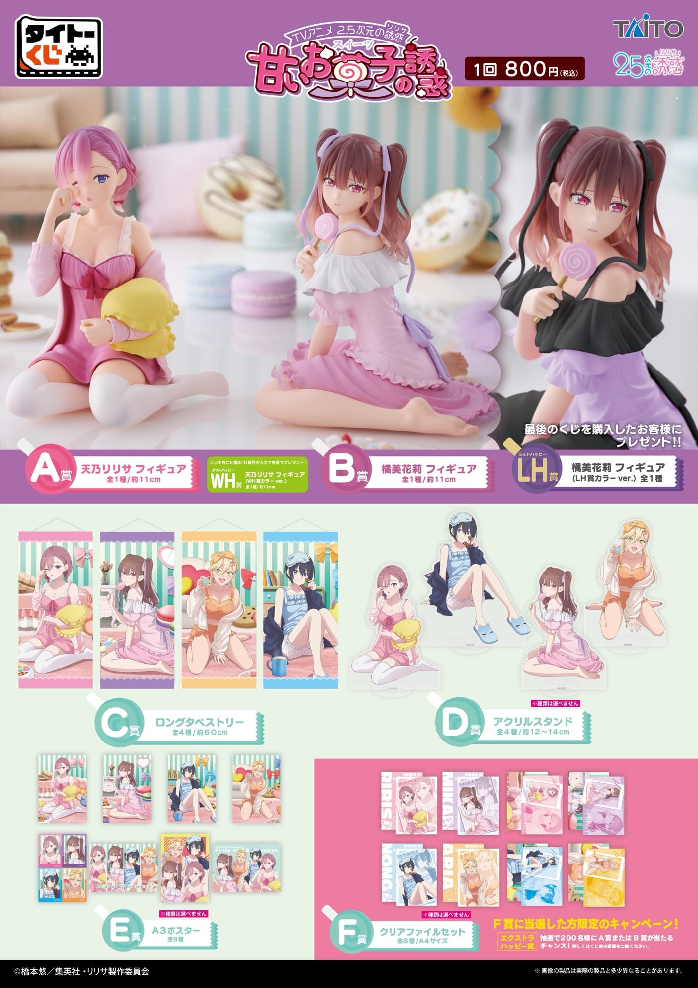 「2.5次元の誘惑 タイトーくじ 甘いお菓子の誘惑」では、本商品のために描き下ろされた「ネグリジェ」衣装のリリサ、美花莉らのイラストを使用したフィギュアやアクスタなど豪華賞品が多数登場!