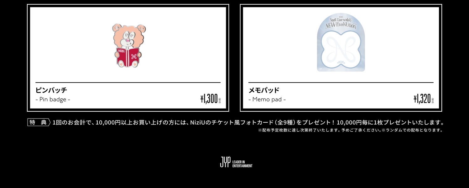 「NiziU」ポップアップストアにて、グッズを10,000円(税込)ご購入毎に「チケット風フォトカード(全9種)」をランダムに1枚プレゼント!