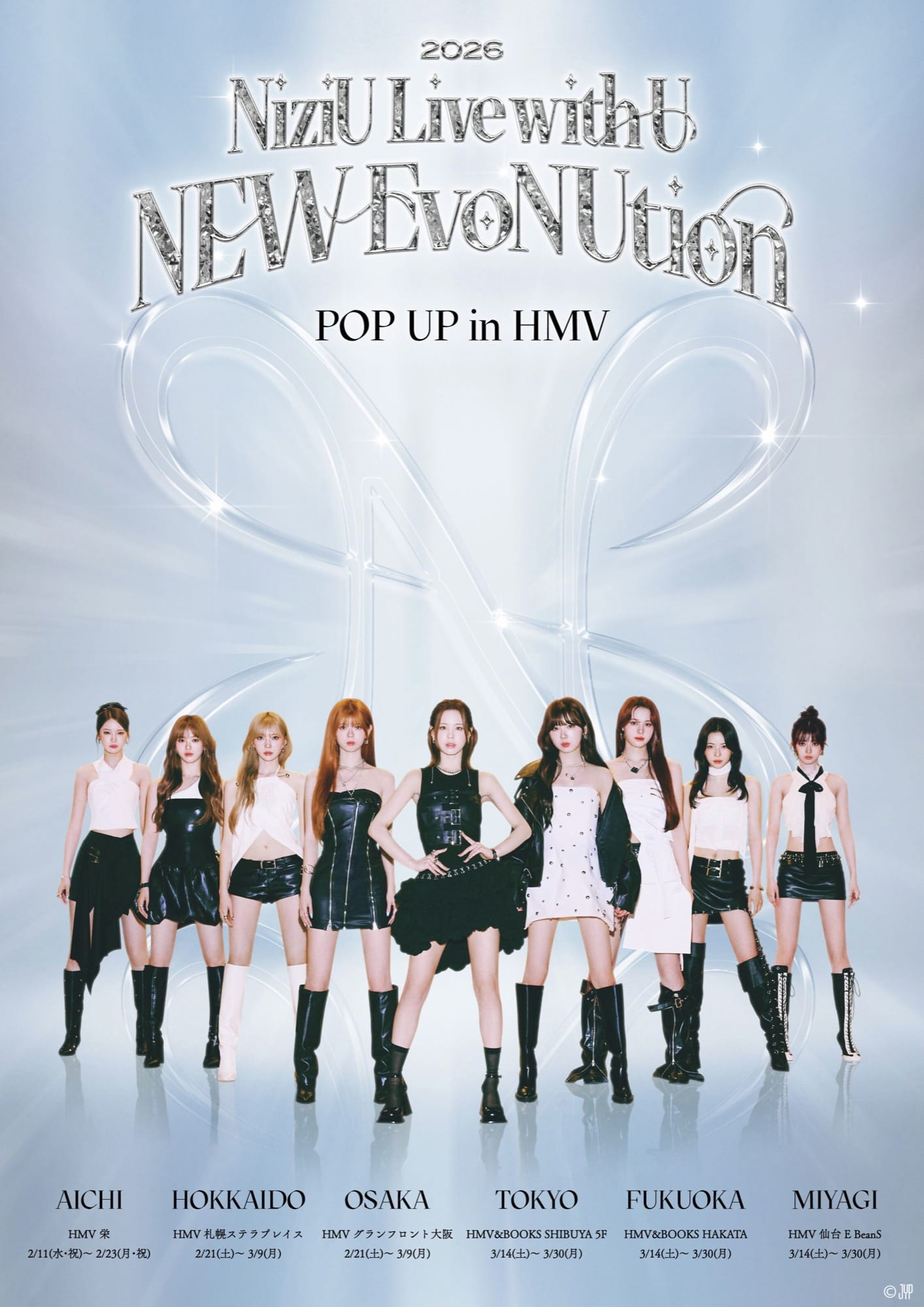 大人気9人組女性アイドルグループ「NiziU (ニジュー)」のポップアップストアが、HMV 全国6か所 (愛知/北海道/大阪/東京/福岡/宮城)にて、2026年2月11日〜3月30日まで開催される。