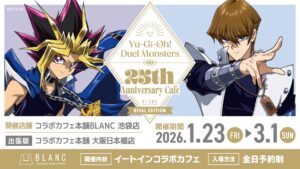 高橋和希先生による漫画を原作とする大人気シリーズ「遊☆戯☆王デュエルモンスターズ」× コラボカフェ本舗BLANCにて2026年1月23日〜3月1日までコラボカフェが開催される。作品の世界観やキャラクターをイメージしたコラボメニューがお楽しみいただける他、描き下ろしイラストを使用したコラボカフェ限定グッズが登場!