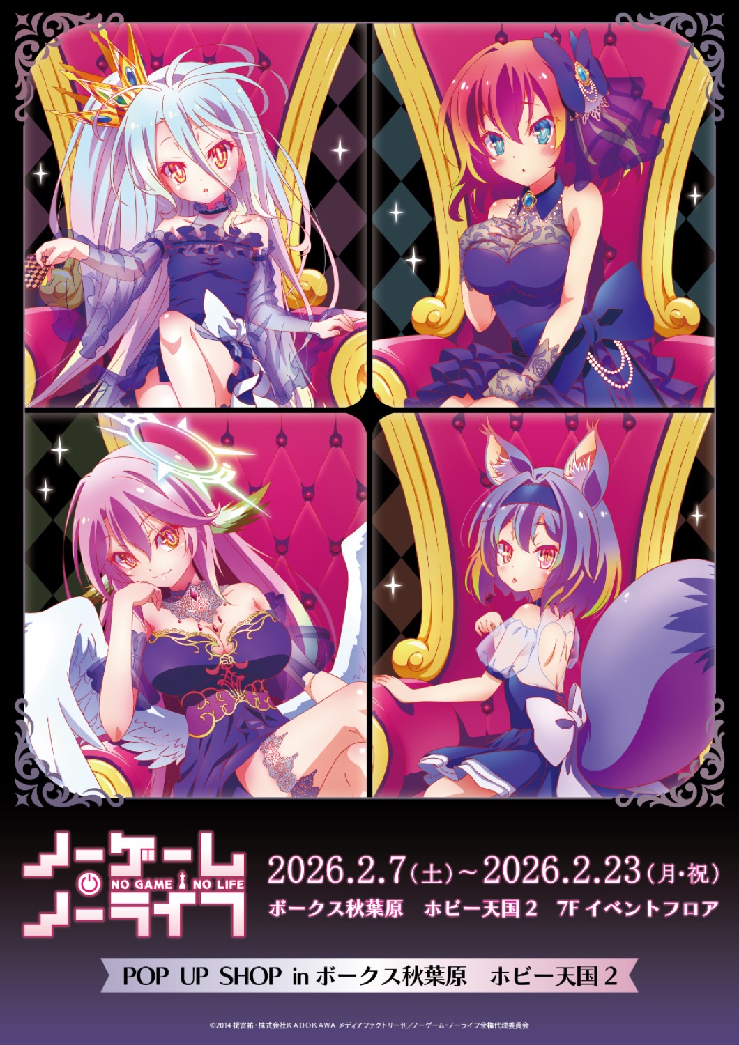 榎宮祐先生の人気ライトノベルを原作としたアニメ「ノーゲーム・ノーライフ (ノゲノラ)」のポップアップストアが、ボークス秋葉原ホビー天国2 (7Fイベントフロア) にて2026年2月7日〜2月23日まで開催される。
