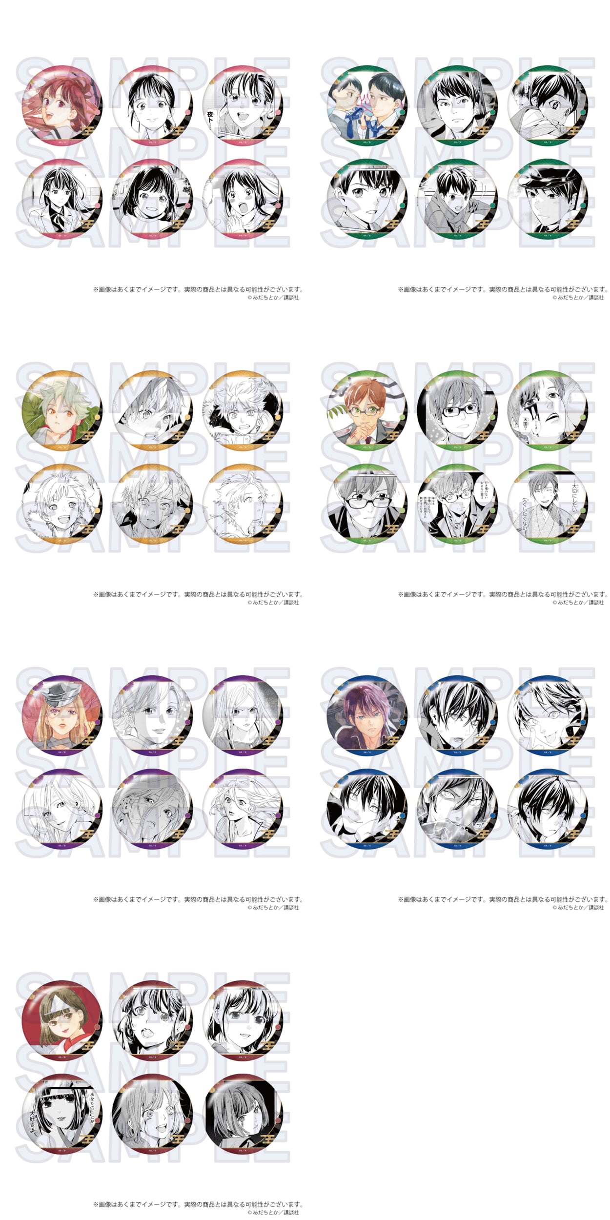 漫画コマを切り出した「コレクション缶バッジ Vol.2」は、キャラクターごとに全6種セットのコンプリートBOXとなっており、表情違いのΦ57mm缶バッジが6つ一度に揃う。