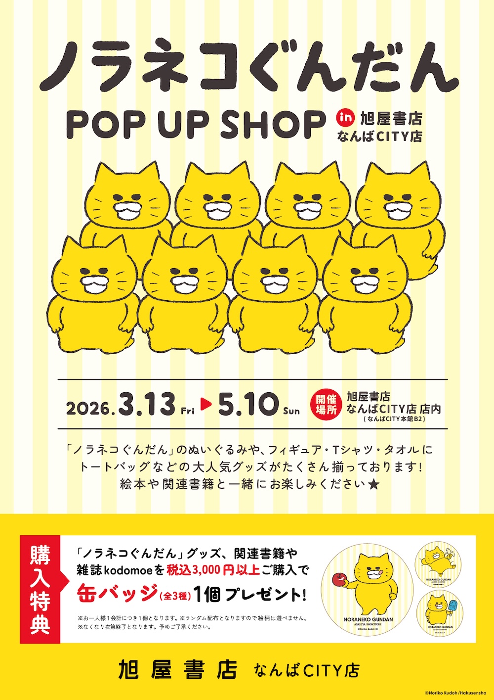 \3月13日(金)より、大阪・旭屋書店なんばCITY店にてPOP UP SHOPスタート‼️#ノラネコぐんだん の新&定番グッズ、催事限定グッズ、書籍等が勢揃い! 購入特典は缶バッジ(全3種、ランダム配布、なくなり次第終了)です✨ ワークショップもあります👍… pic.twitter.com/z6fL4YmeyN