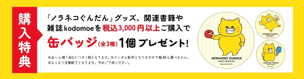 さらに、「ノラネコぐんだん」関連グッズ、書籍、雑誌kodomoeを含めて、3,000円(税込)お買い上げ毎に特典として「缶バッジ (全3種)」をランダムに1枚プレゼント!