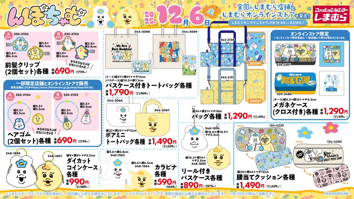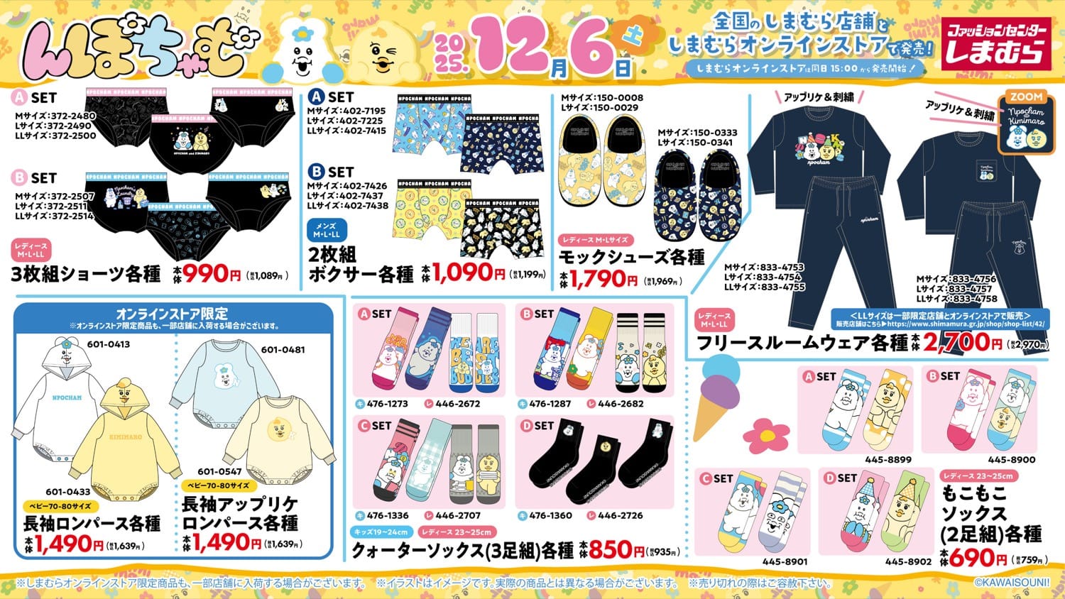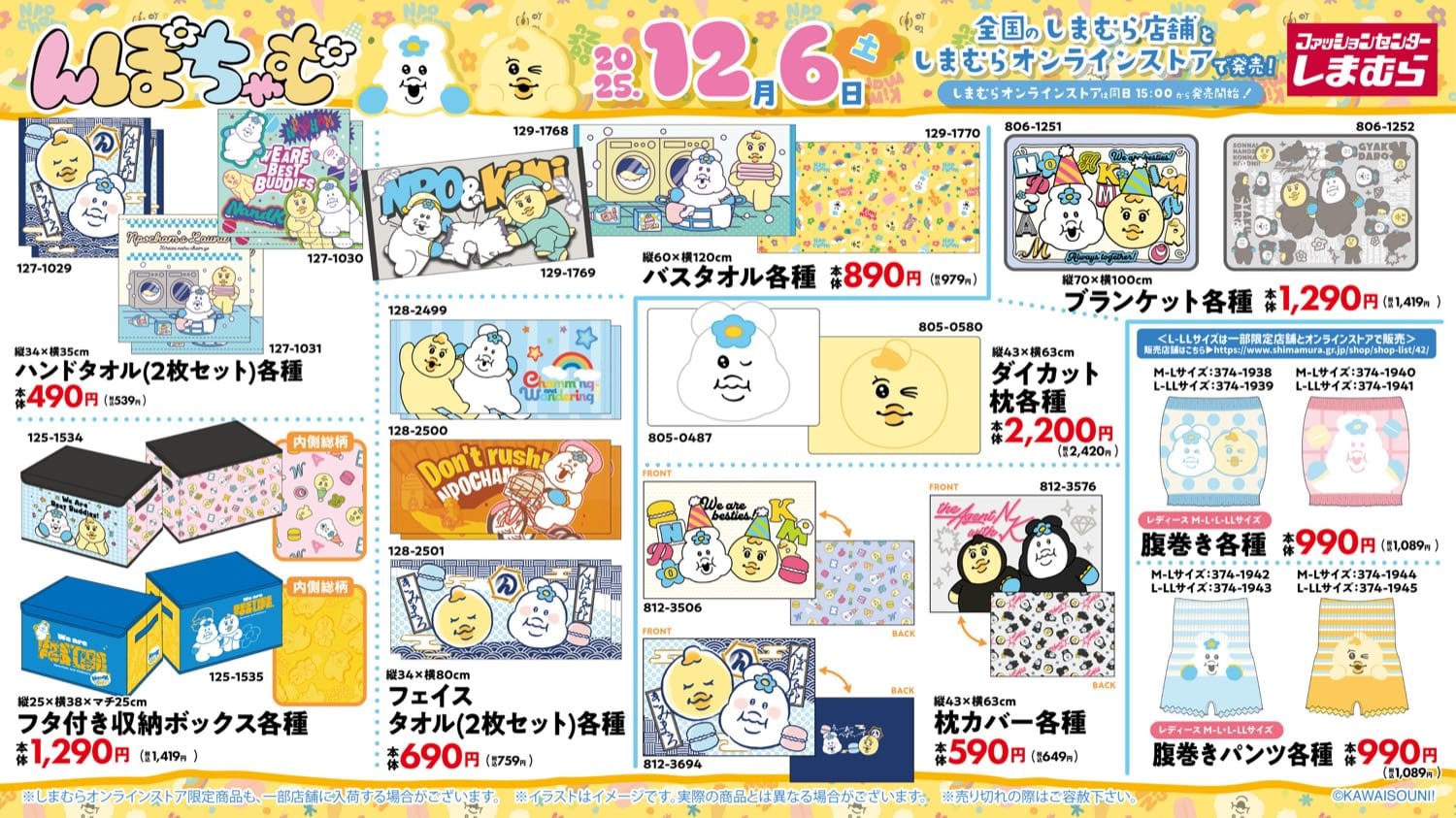 2025年12月6日より全国のファッションセンター「しまむら」と「しまむらオンライン」にて、「んぽちゃむ」のコラボグッズを順次発売!