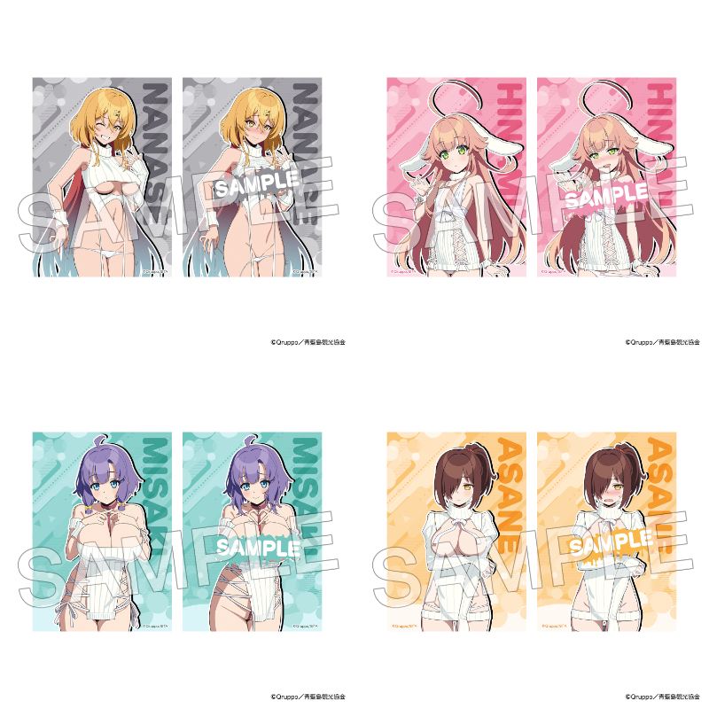 片桐奈々瀬、渡会ヒナミ、畔美岬、橘麻沙音ら人気ヒロインたちのニット姿が魅力的な描き下ろしイラストが登場! 「缶バッジ」や「アクリルスタンドフィギュア」など定番アイテムのほか、1枚目をめくると絵柄が変わる「クリアファイル」や「B2ハーフタペストリー」もラインナップ。 ドキドキの衣装に注目したい新商品をお見逃しなく。