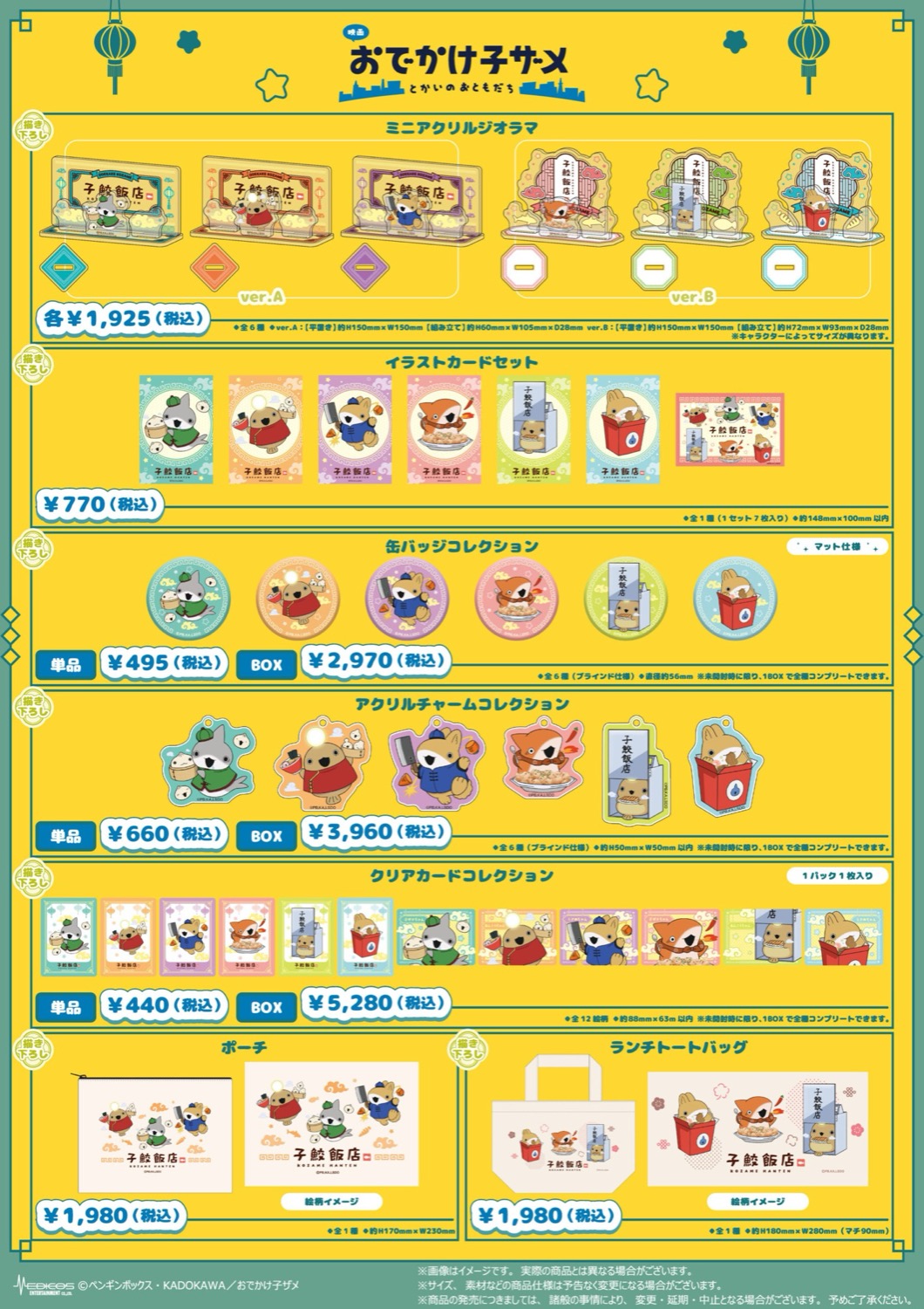 さらに”子鮫飯店”をテーマに子ザメちゃん・あんこうちゃん・うさめちゃんら人気キャラクター達を描き下ろした新規イラストの「ミニアクリルジオラマ」「イラストカードセット」「缶バッジコレクション」などのコラボカフェ限定グッズも発売!