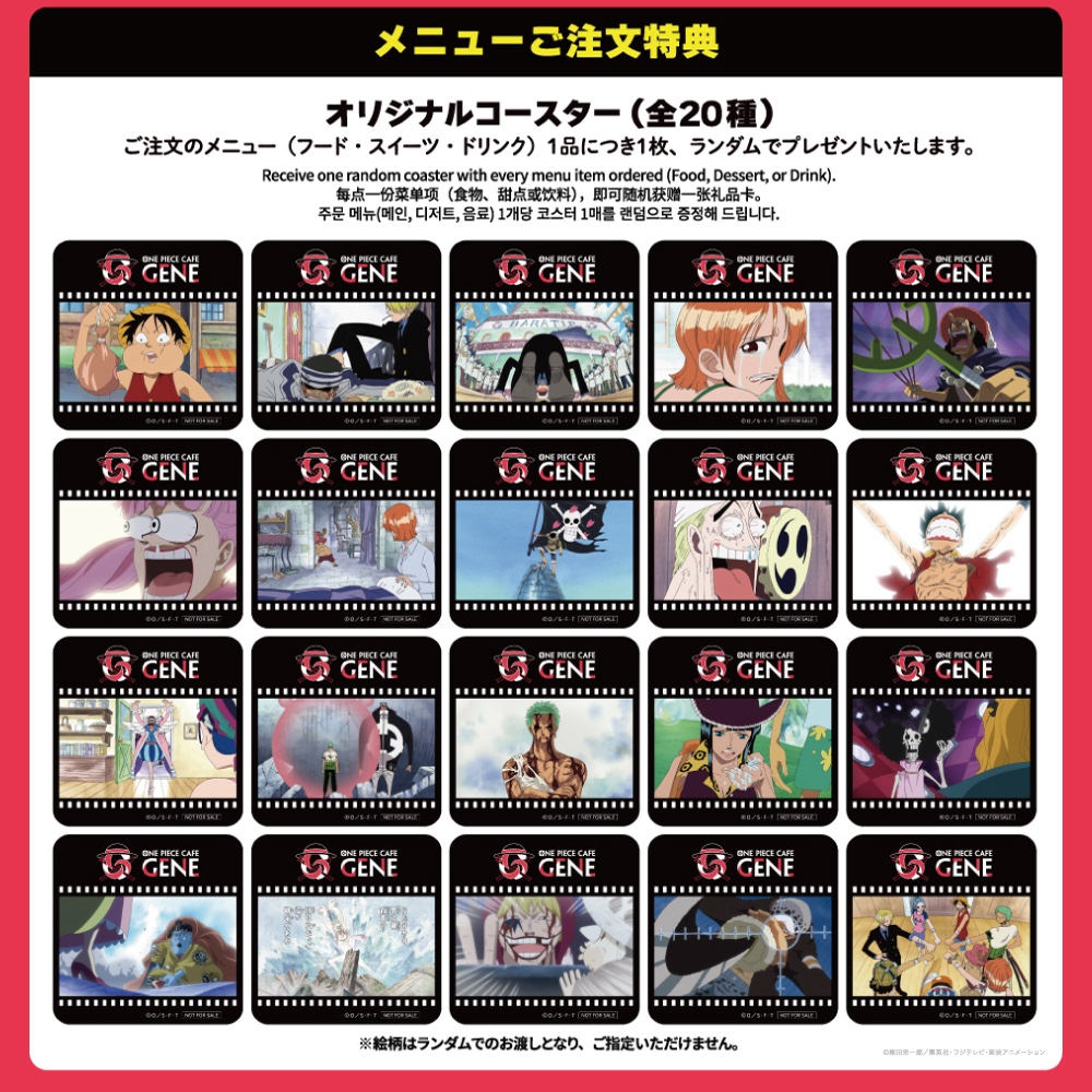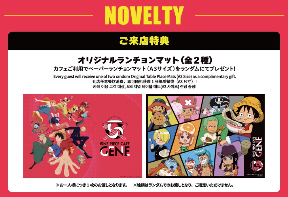 「ONE PIECE CAFE GENE」を、事前予約のうえ利用すると事前ご予約特典として「ONE PIECE CAFE GENE バンド(チャーム付き)」をランダムに1つ、カフェ利用で「ランチョンマット (全2種)」をランダムに1枚プレゼント!