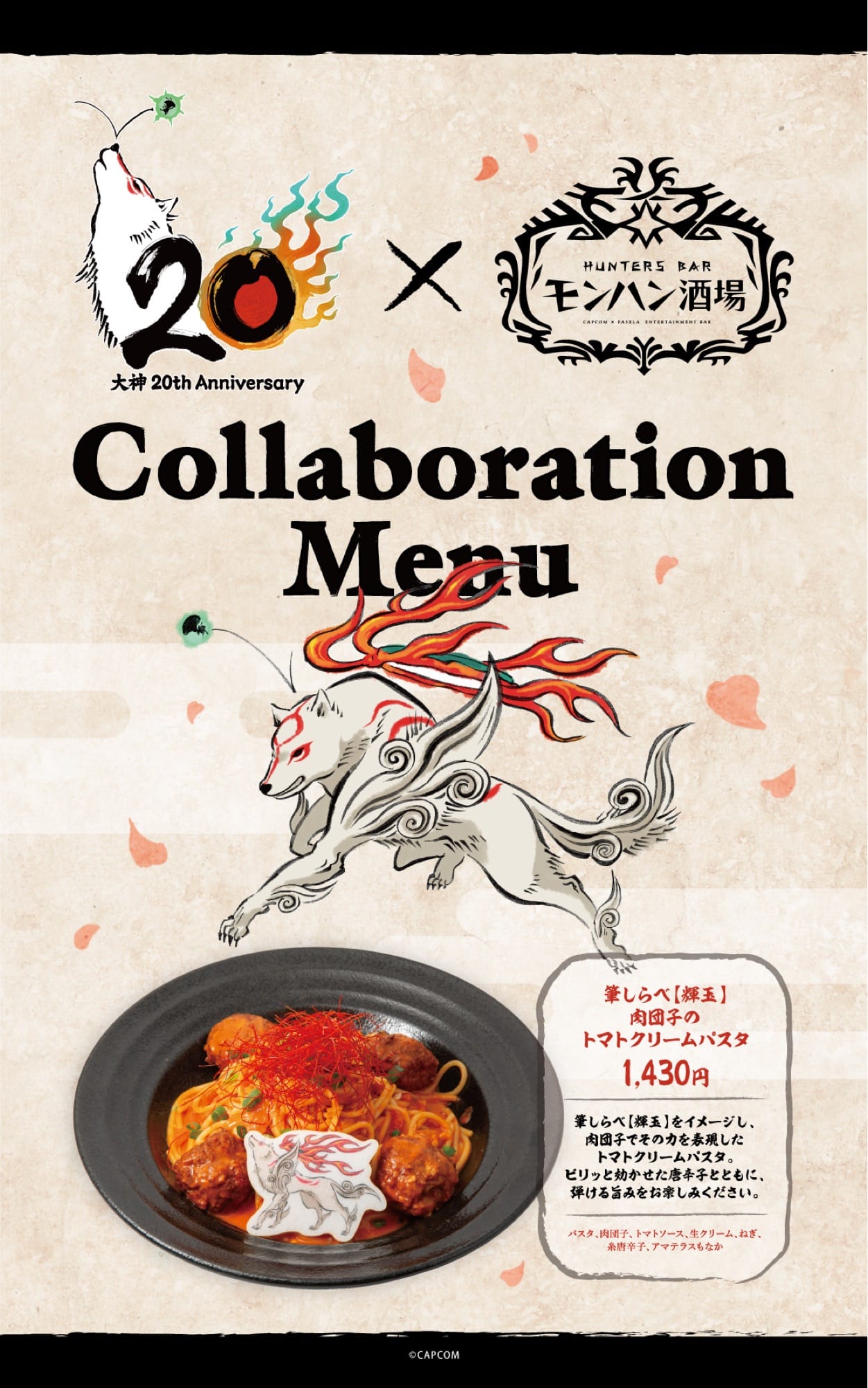 カプコンが贈る大人気和風ファンタジーRPG「大神」シリーズの20周年を記念し、モンハン酒場 東京/大阪にて2026年4月20日〜6月1日までコラボカフェが開催される。