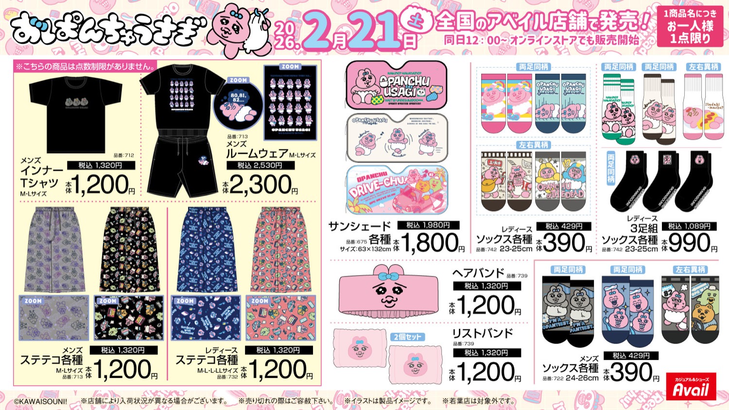 2026年2月21日より全国のアベイルにて、「おぱんちゅうさぎ」のコラボグッズを順次発売!