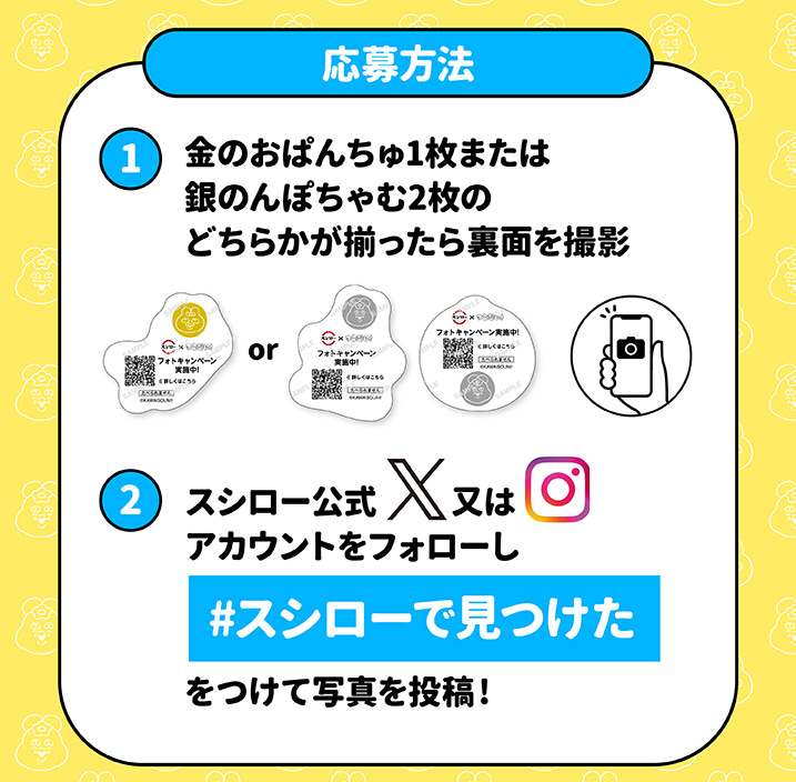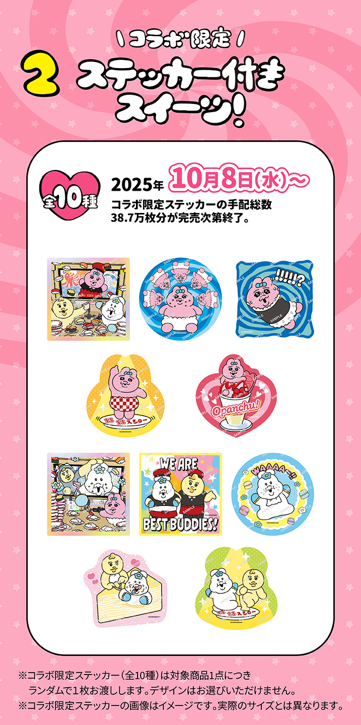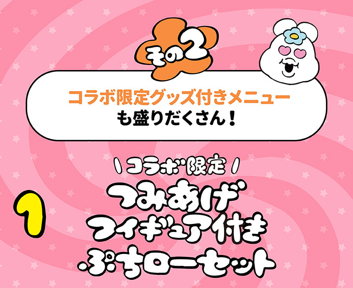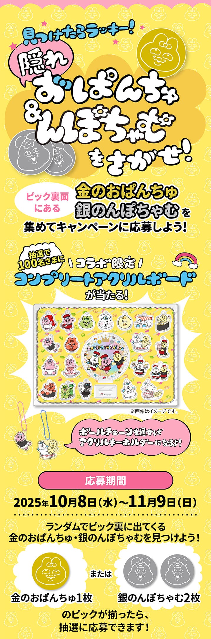 おぱんちゅ・んぽちゃむ・きみまろたちがスシローで働いたりお寿司になったりする描き下ろしイラストを使用したピック・ステッカーが貰えるコラボ限定メニューや、グッズ付きメニュー・グッズ付きお持ち帰りセットが登場。