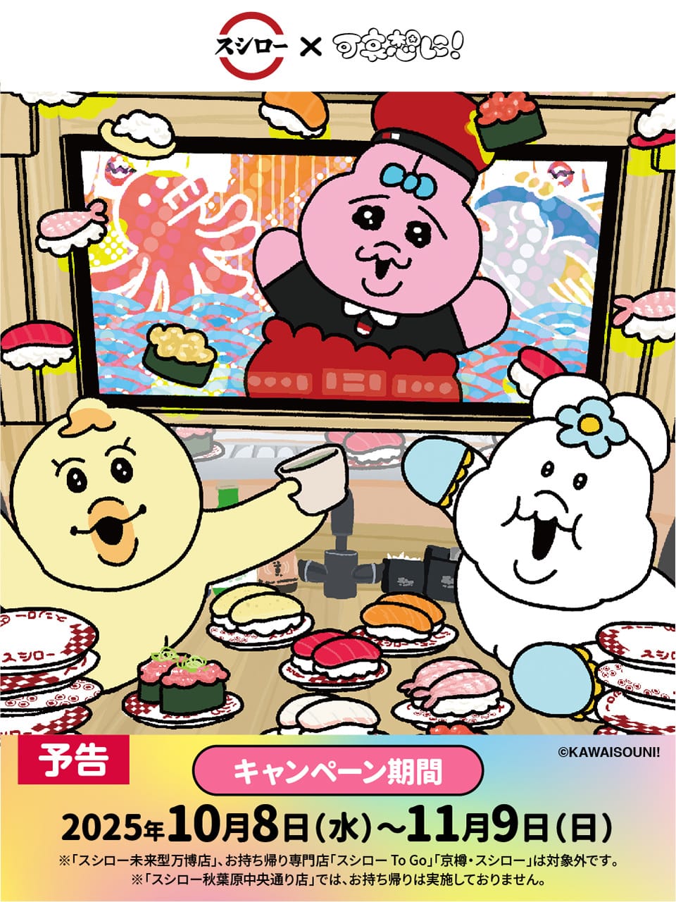 2025年10月8日より全国のスシローにて、おぱんちゅ・んぽちゃむ・きみまろ達が登場する「可哀想に!」コラボ開催!