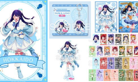 海辺で”ビキニ”を着た3人が振り返る描き下ろしイラストや、「鶴見留美」とともに”スクール水着”姿を着てプールサイドに佇む描き下ろしイラストを使用した新作グッズがラインナップ。