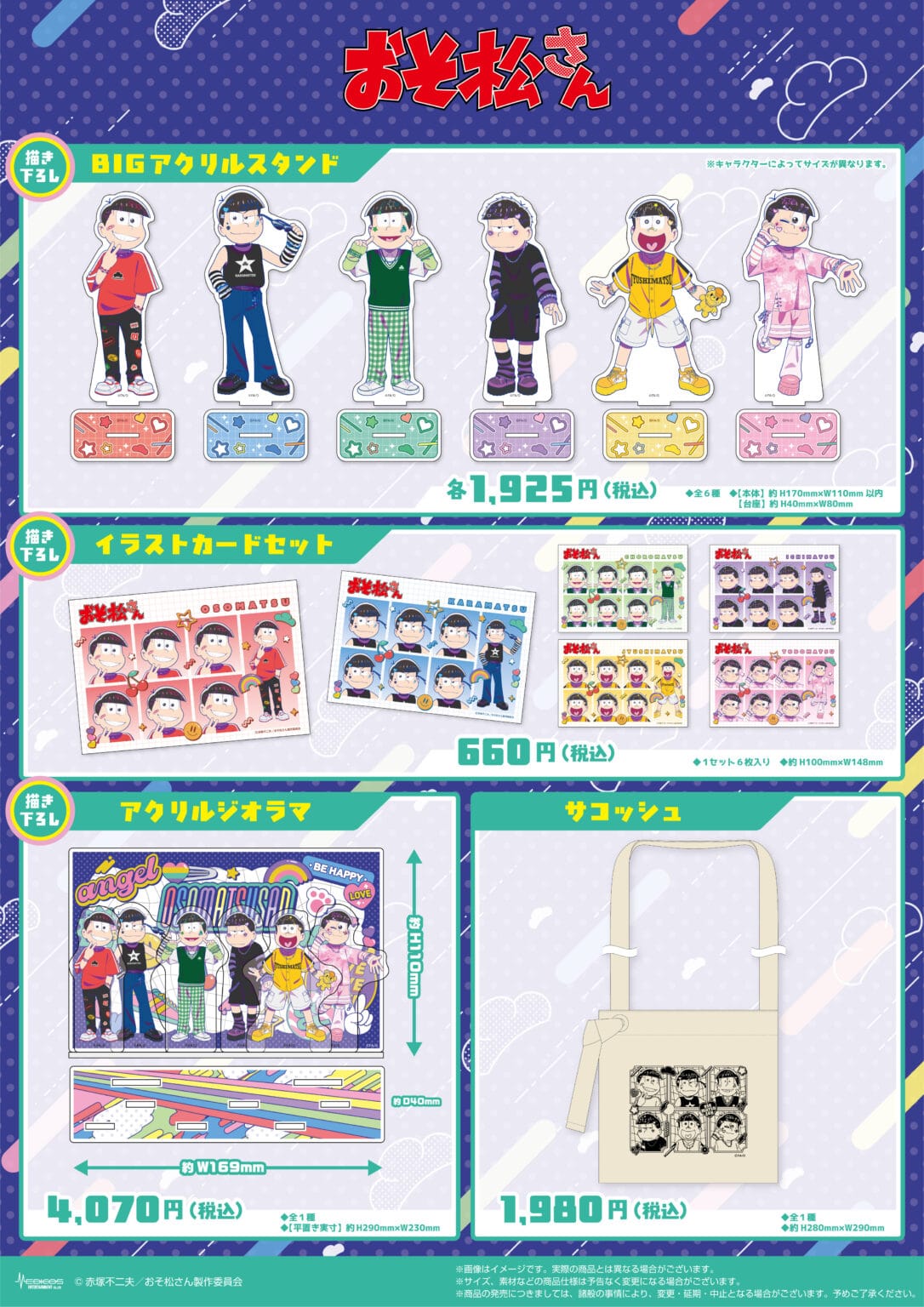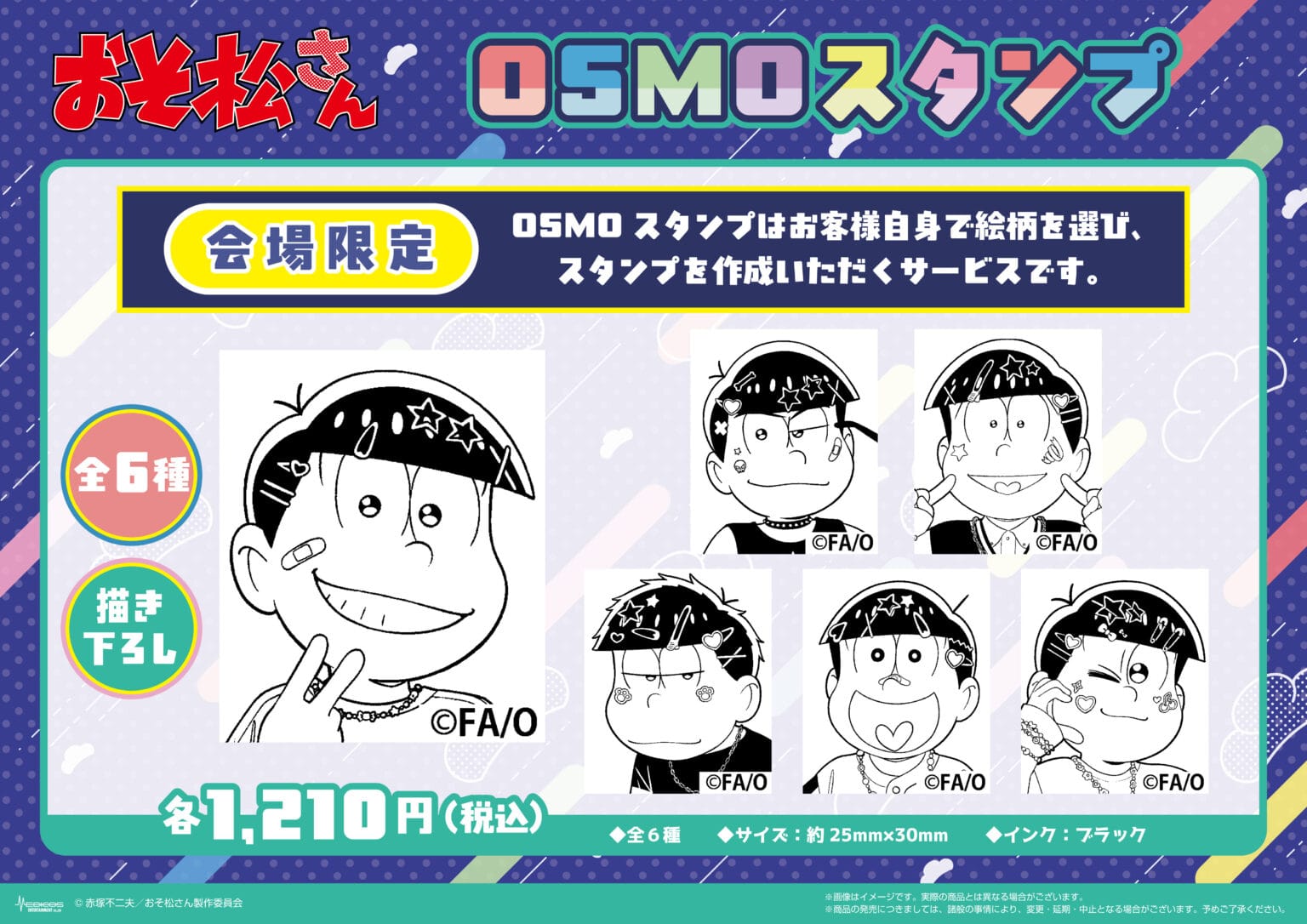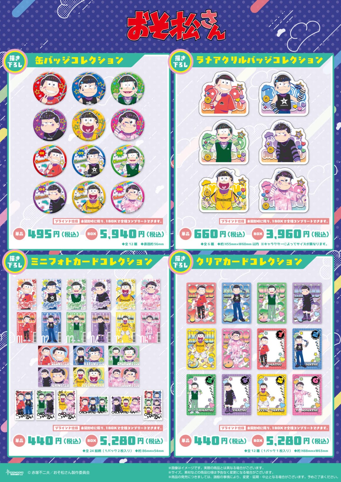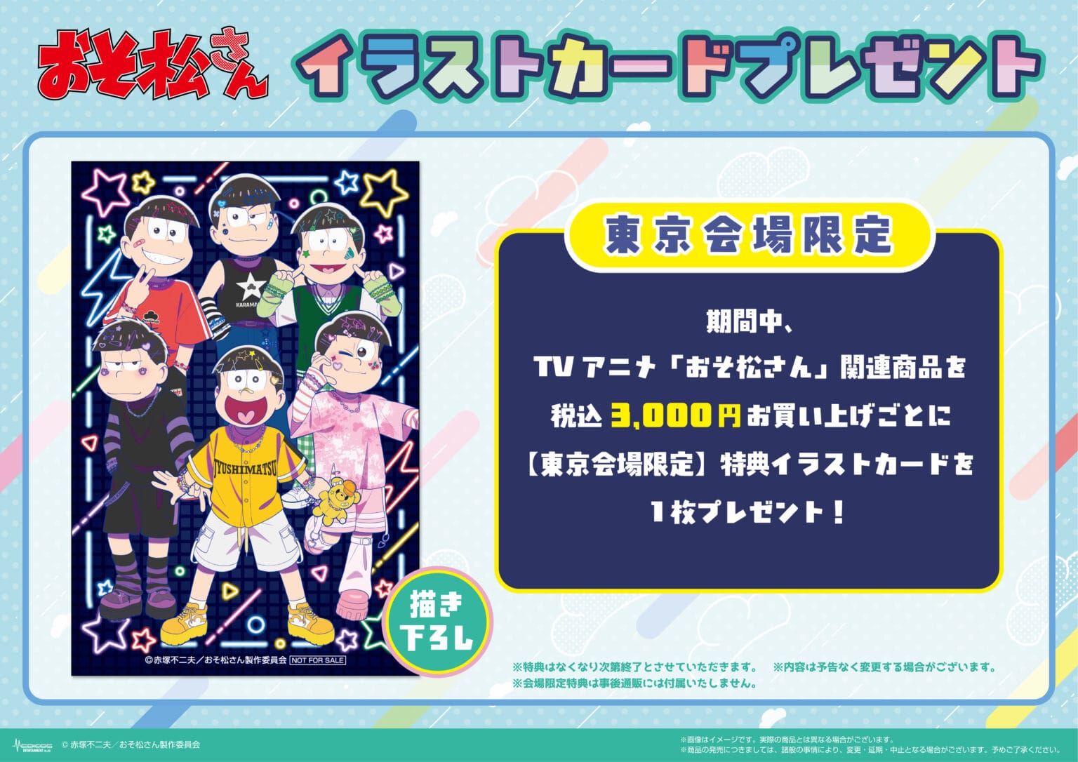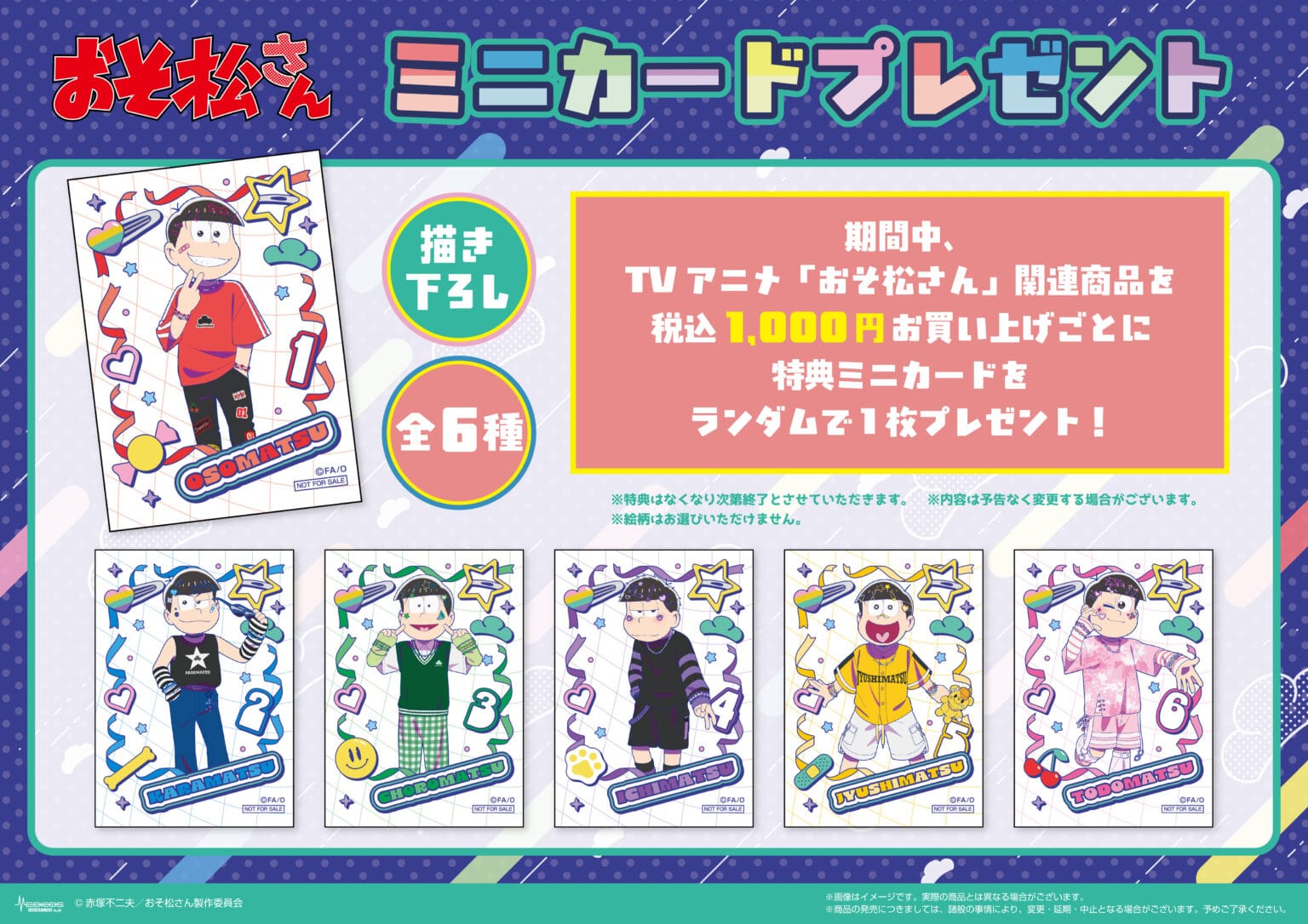 アニメ「おそ松さん」ポップアップストアでは、イベント限定「デコラ」テーマの描き下ろしイラストを使用した新作グッズが多数販売される他、グッズをお買い上げ1,000円(税込)ごとに特典として描き下ろしノベルティ「ミニカード 全6種」をランダムに1枚プレゼント。