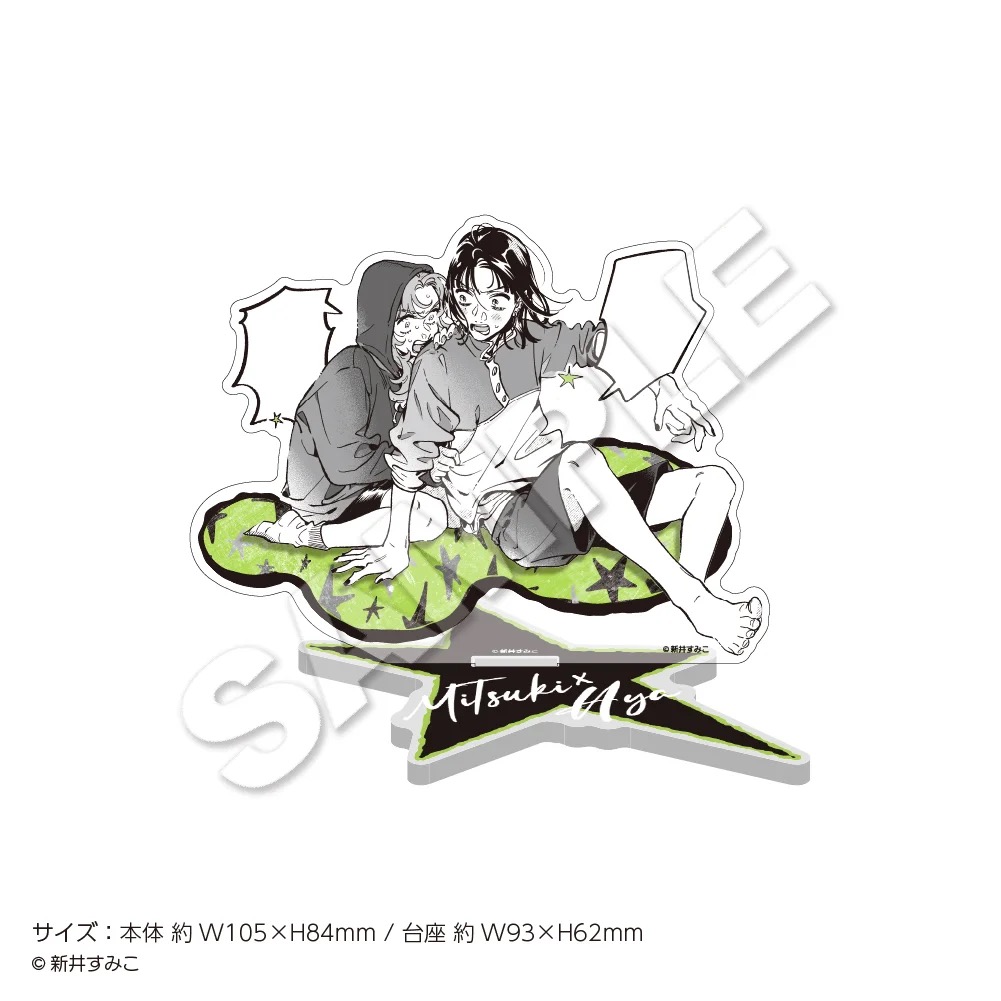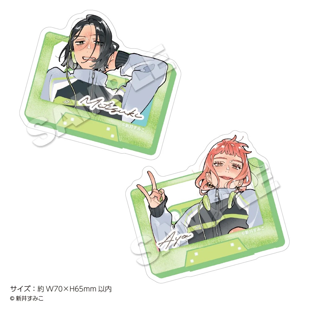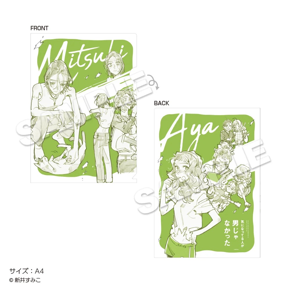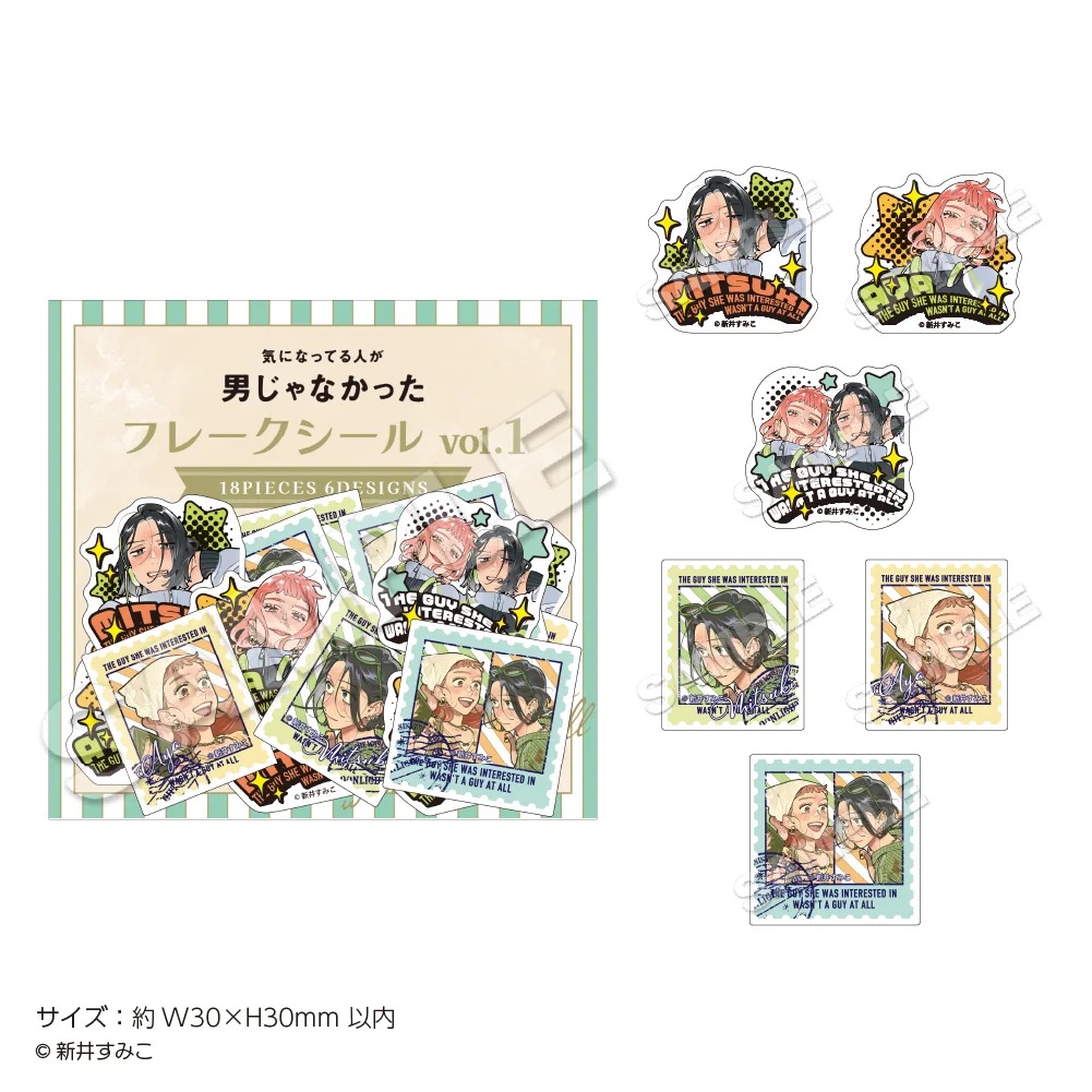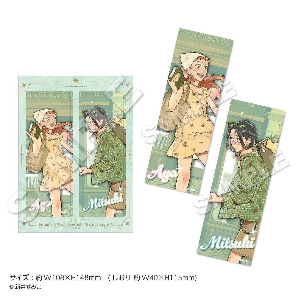 「気になってる人が男じゃなかった」ポップアップストアでは、古賀みつき・大沢あやが書籍を手にするイラストや、「music」をテーマに描かれた描き下ろしイラストを使用した新作グッズが多数販売される他、グッズをお買い上げ2,500円(税込)ごとに特典として描き下ろしノベルティー「特製ステッカー 全8種」をランダムに1枚プレゼント!