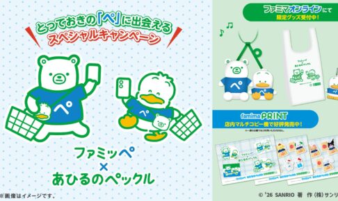 世代を超えて愛されるサンリオの人気キャラクター「あひるのペックル」 × ファミリーマート公式アプリ・ファミペイのキャラクター「ファミッペ」のコラボアイテムが、2026年3月31日までファミマオンライン限定で販売される。