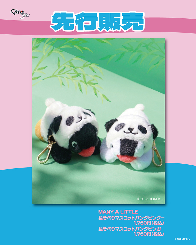 パンダの着ぐるみ姿に身を包むピングー・ピンガたちのビジュアルを使用した「ねそべりマスコット パンダピングー」「ねそべりマスコット パンダピンガ」が先行販売される。