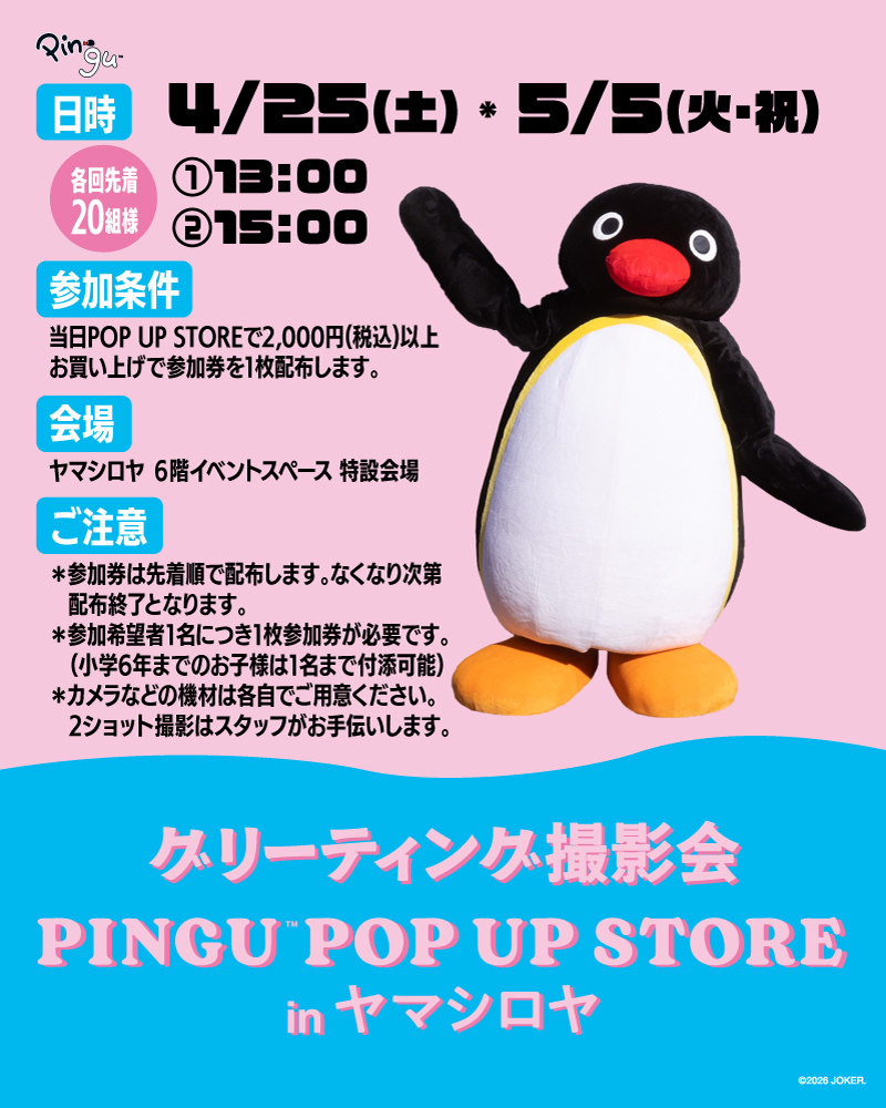さらに、4月25日と5月5日は、グッズを2,000円(税込)以上ご購入すると1枚もらえる参加券で、ピングーと一緒に撮影ができる「PINGU™ グリーティング撮影会」に参加できる。