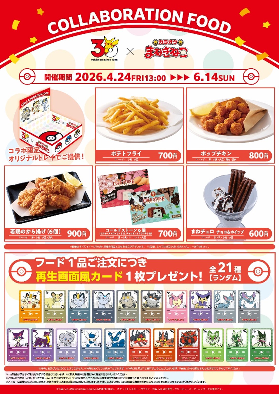 2026年4月24日より全国のカラオケまねきねこにて開催される「ポケモン30周年コラボキャンペーン」では、対象のフードを注文するとコラボ限定オリジナルトレイで提供!