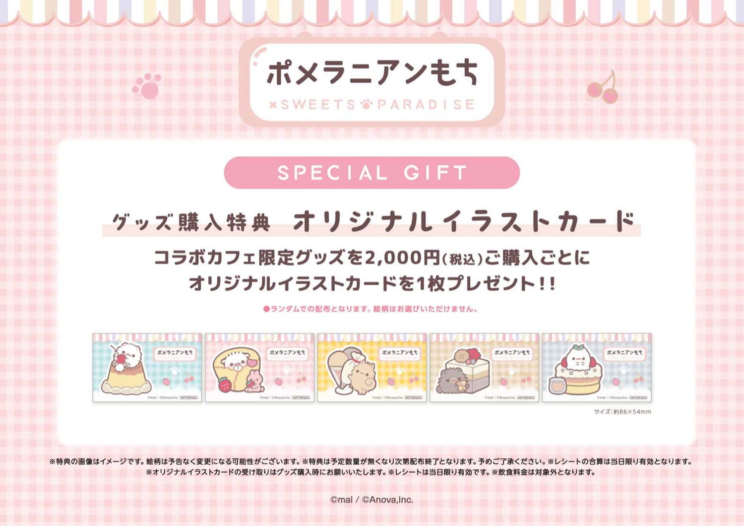 「ポメラニアンもち × スイーツパラダイス 原宿/横浜/神戸」コラボでは、コラボメニューの注文やグッズの購入金額に応じてオリジナルノベルティーをプレゼント!