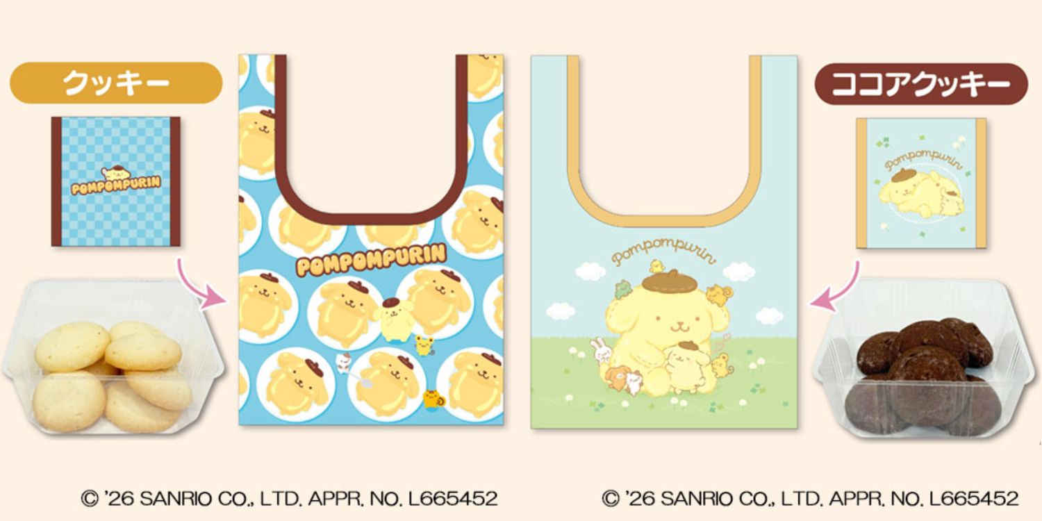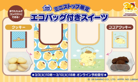ポムポムプリン30周年を記念し、ミニストップ オンラインストアにて「折りたたみ式エコバッグ付きクッキー」2種が登場。