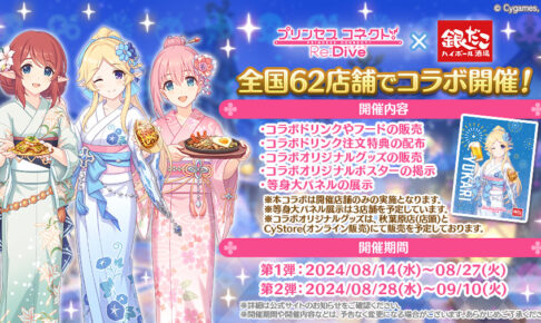 「プリンセスコネクト!Re:Dive (プリコネR) × 銀だこハイボール酒場」では、浴衣姿のユイ、ミサト、ユカリらの描き下ろしイラストを使用したアクリルスタンドのコラボ限定グッズ(店舗は秋葉原店のみ)、コラボドリンクやコラボフードの販売、メニューの注文で貰えるカードステッカーの特典、オリジナルポスター掲示や等身大パネル展示など盛りだくさん!