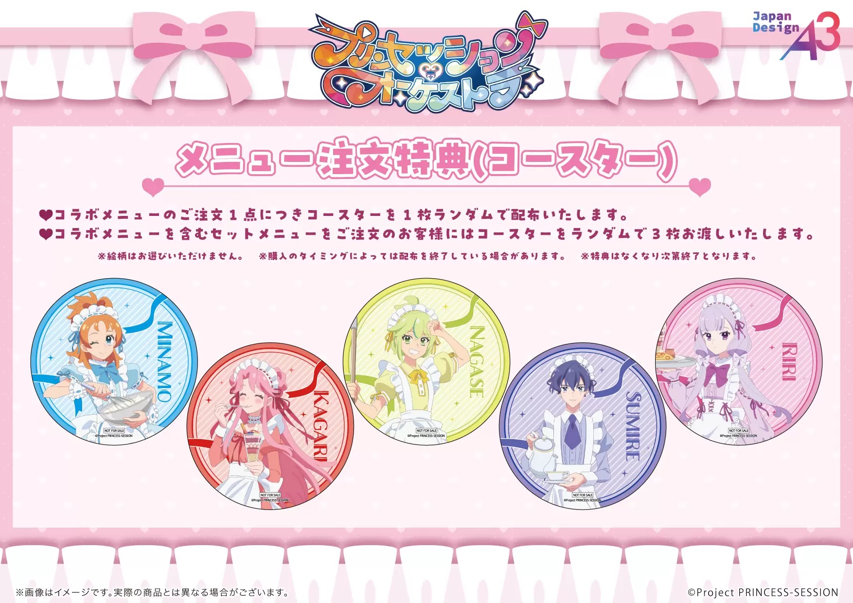 「プリンセッション・オーケストラ」コラボカフェでは、コラボメニュー1点ご注文ごとに、特典として「コースター (全5種)」をランダムで1枚プレゼント!