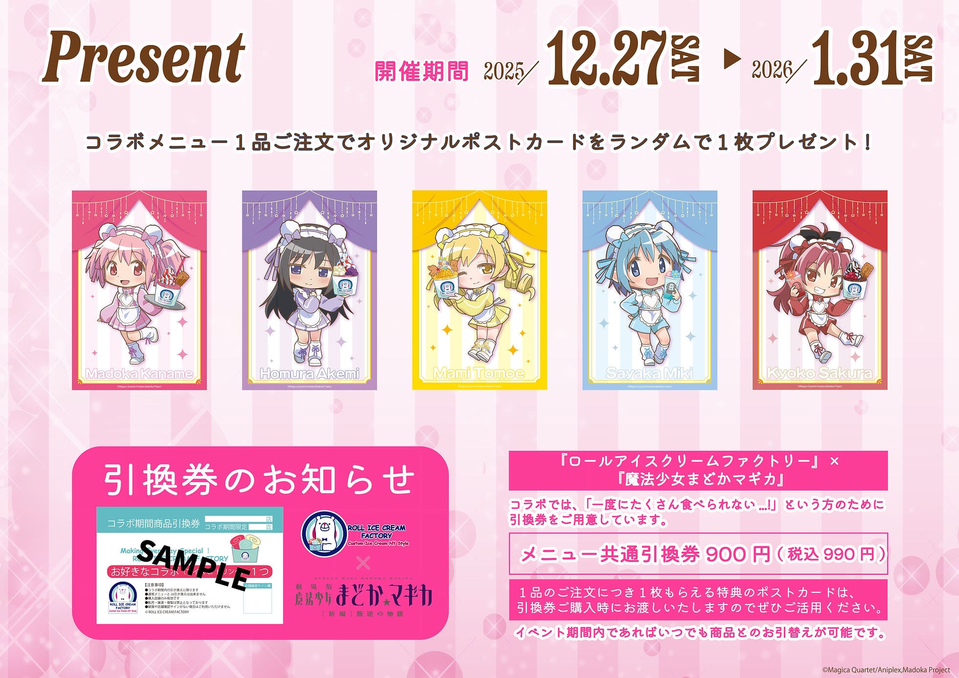 新房昭之×虚淵玄×蒼樹うめ×シャフトが手がけたアニメ「魔法少女まどか☆マギカ」× ロールアイスクリームファクトリー5店舗 (TOHOシネタワー店/池袋東口店/原宿表参道店/天王寺ミオ店/札幌すすきの店)によるコラボが、2025年12月27日〜2026年1月31日までの期間限定で開催される。