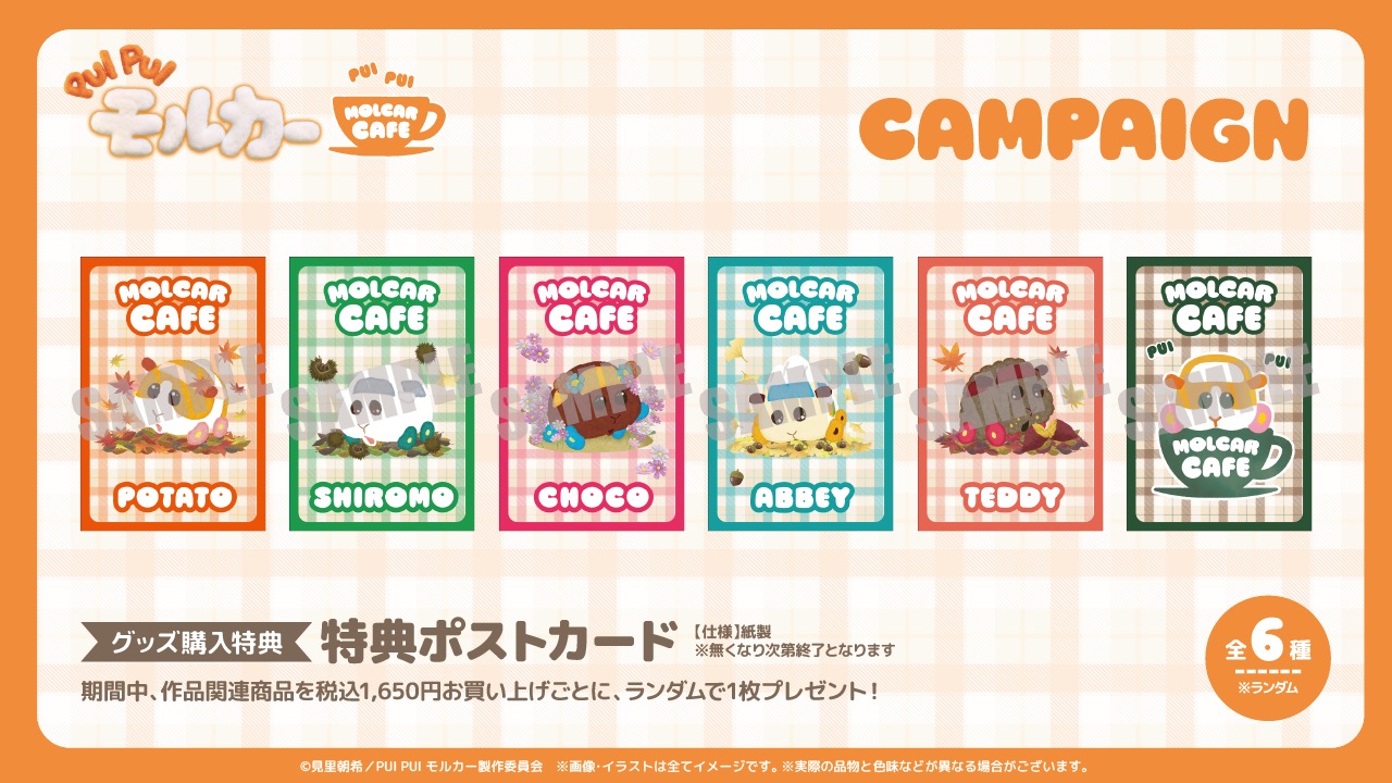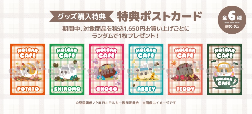 対象のグッズを1,650円(税込)購入ごとに、特典として「ポストカード 全6種」の中からランダムで1枚がプレゼントされる。